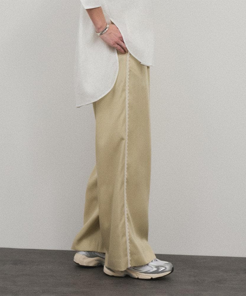 さりげない光沢とレースが上品な、ウエストゴムが嬉しい大人のイージーパンツ。