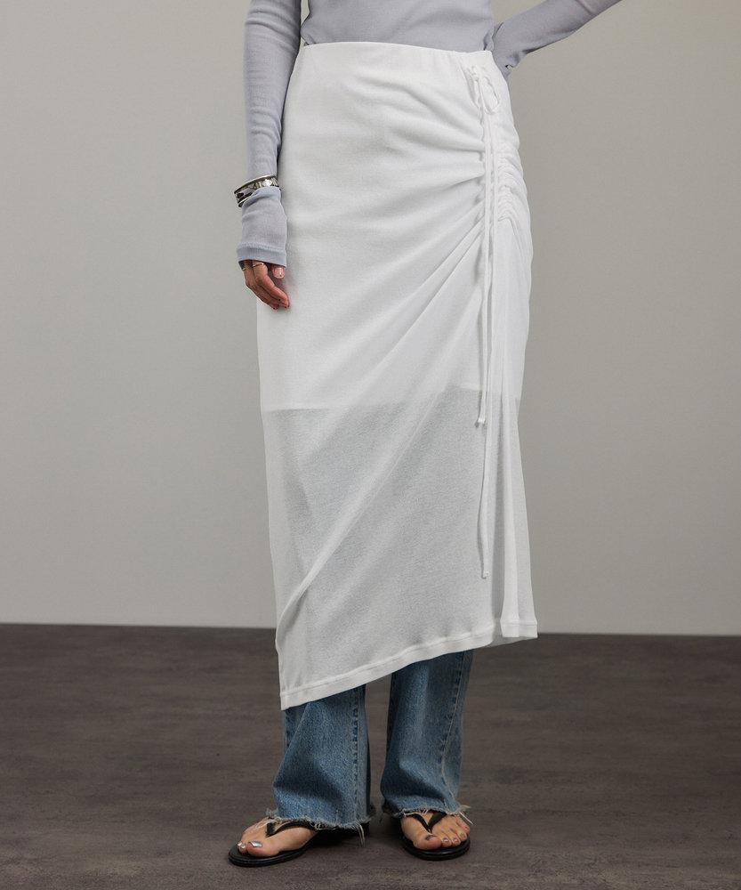 シアーでソフトな素材を使用した、シャーリングで調節ができるタイトスカートです。