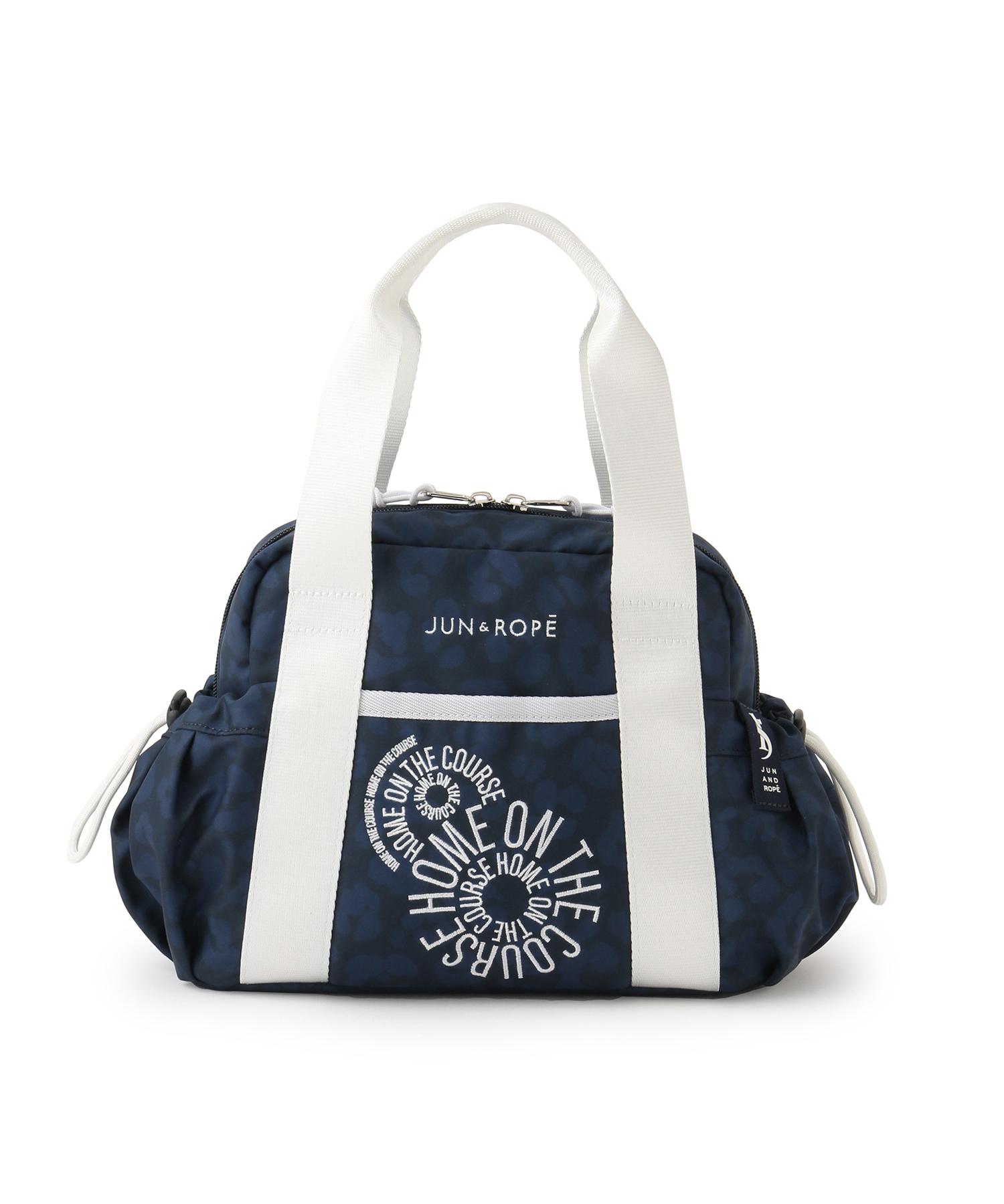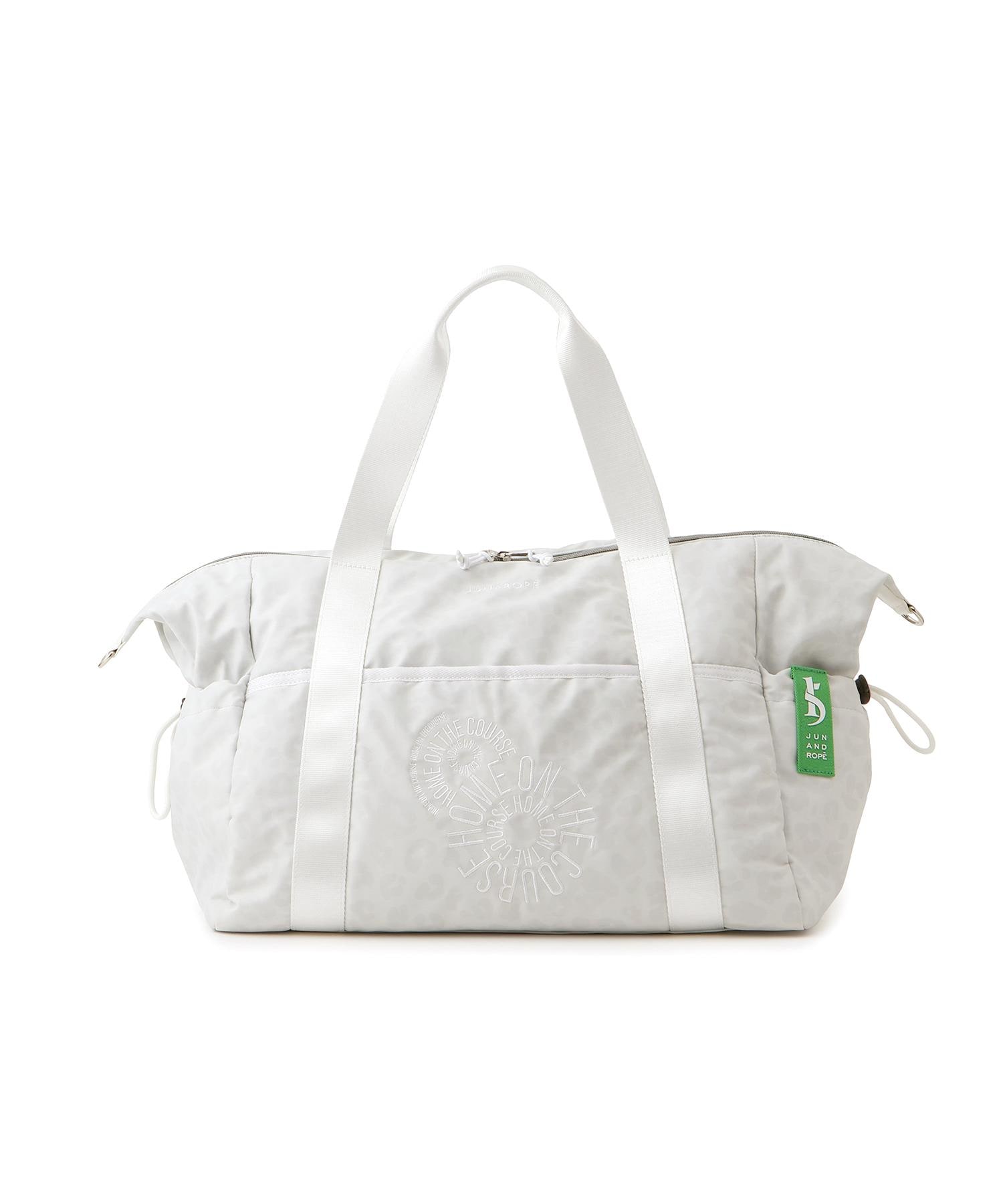 軽量のポリエステル素材にアニマルプリントとオリジナル刺繍を施したボストンバッグ。コード付きのサイドポケットとフロントのスリットポケットに加え、