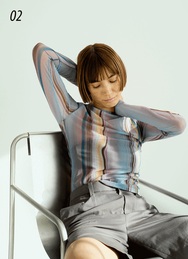 ブラウンのトライアングルビキニにレイヤードしたのは、メッシュ素材のグラフィカルなトップスとラップスカート。プールサイドではもちろん、シアー素材のロングスリーブトップスとスカートは、タウンウェアとレイヤリングしても今っぽく仕上がるはず。