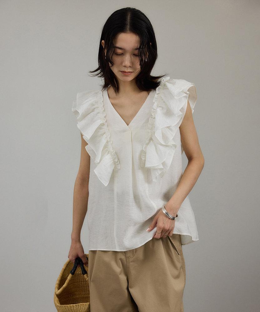 前後2WAYで首元の印象を変えられる、リネンブレンドのフリルブラウス。