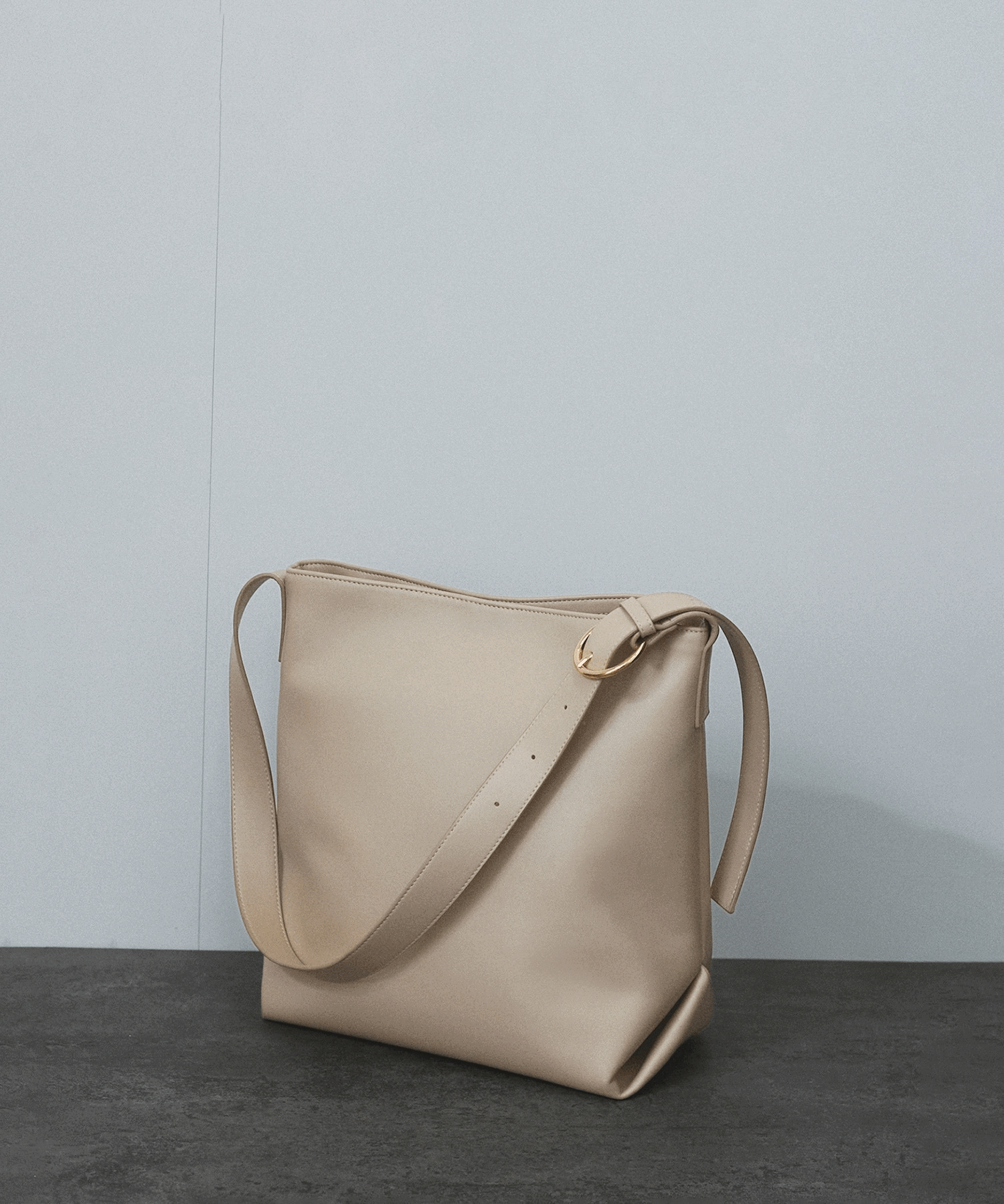 太めのショルダーとざっくりしたマチ広めのシルエットが今年らしいバケットバッグです。