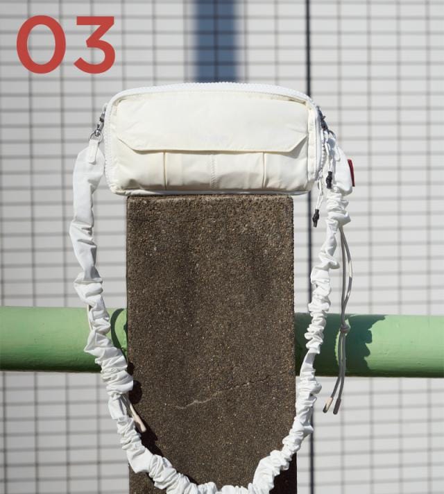 合わせるストラップにはくしゅくしゅっとしたシルエットが特徴の「バンジーストラップ」をチョイス。内側にドローコードが入っているので長さとボリューム感を調整可能。あえてホワイトで揃えることで、バッグとストラップの特徴的なシルエットが際立ちます。