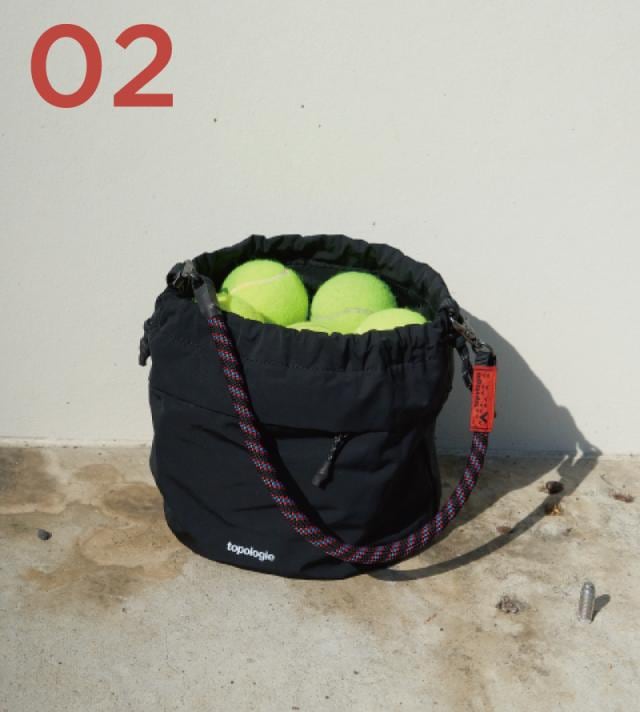 リバーシブルバケットと合わせたいのが手首に巻いたり、肩にかけたりできる2WAYタイプの「リストストラップ」。ブラックをベースにブルーとレッドを組み合わせた個性的なカラーリングに。バッグはシンプルに、ストラップで遊び心を効かせるのも〈Topologie〉の楽しみ方のひとつです。