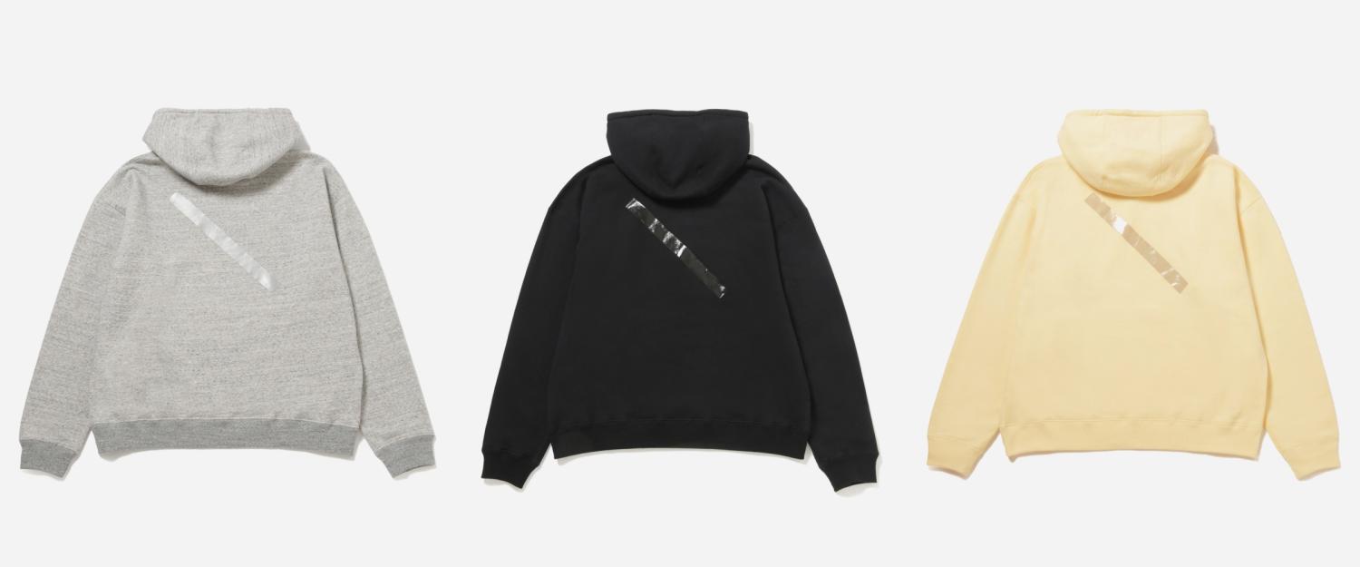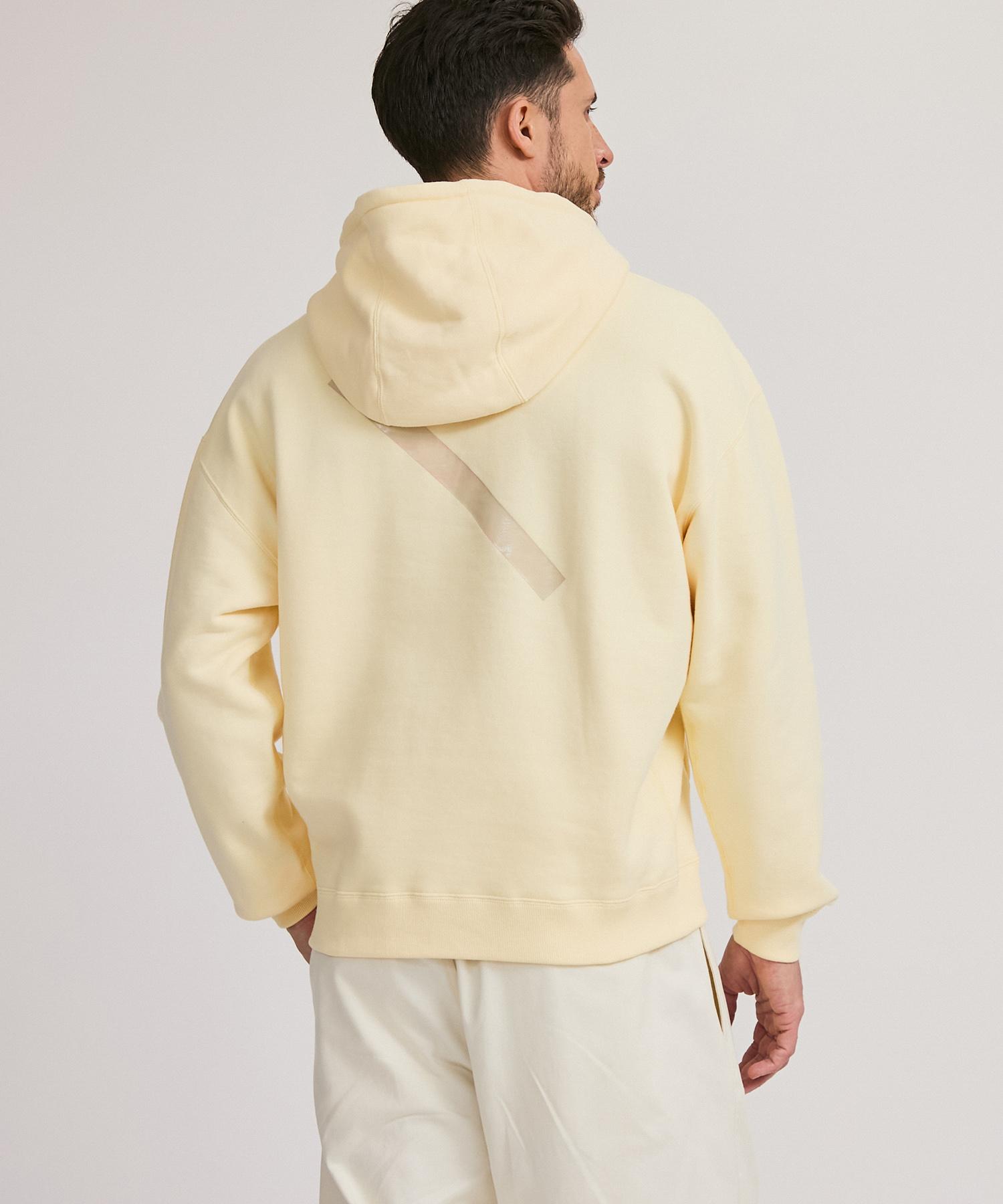 シルエットは、丸みのある身幅と袖でゆとりを持たせ、肩は大きく落ちたドロップショルダーのリラックスしたサイズ感です。 立体的に切り替えたフードのパターンもポイントになっています。 バックスタイルは、スラッシュの大きなプリントが入ります。
