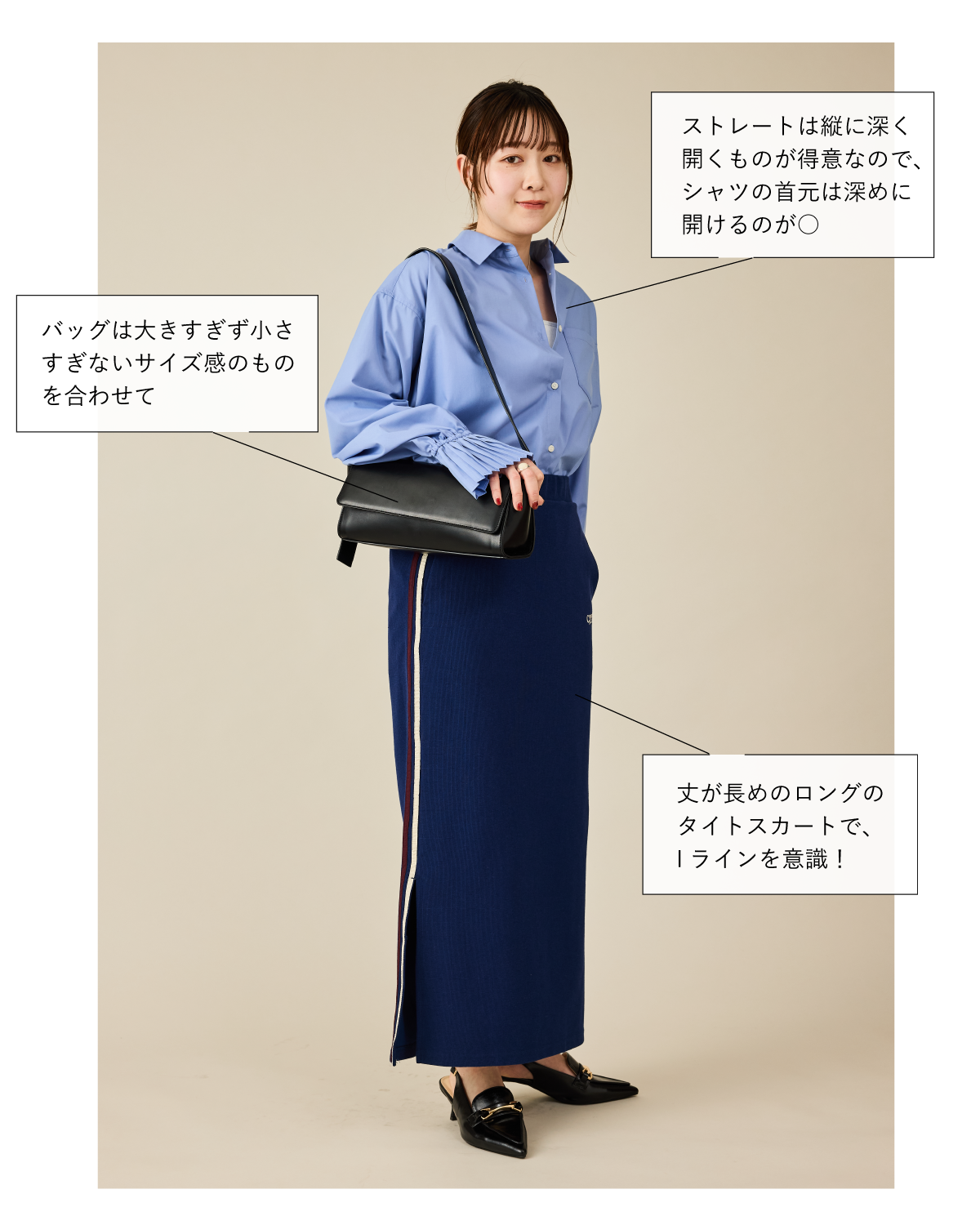 ストレートタイプの人は、全体的に立体感があり筋肉も感じさせるメリハリのあるボディを持っているので、身につけるものも厚みとハリがあるシンプルなデザインをセレクトするのが◎ 正統を意識したクラス感のあるアイテムが似合い、引き算スタイルも得意なので、シンプルにまとめるとおしゃれ感がアップ!