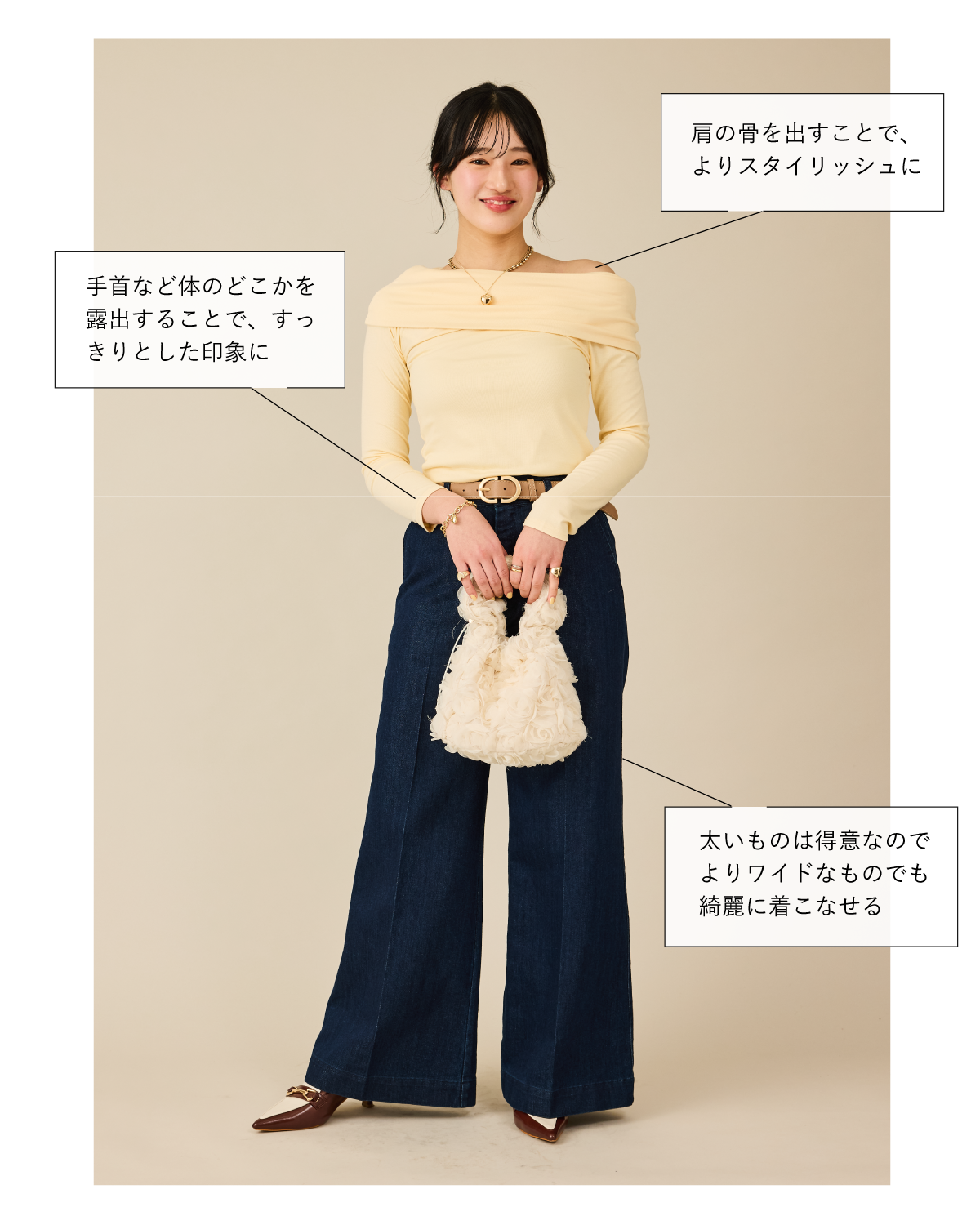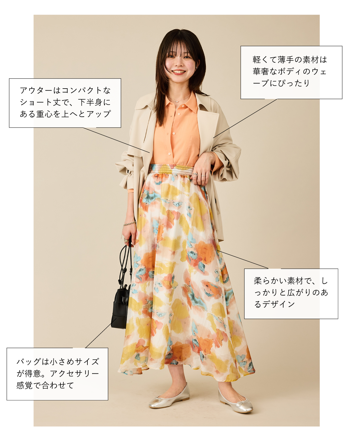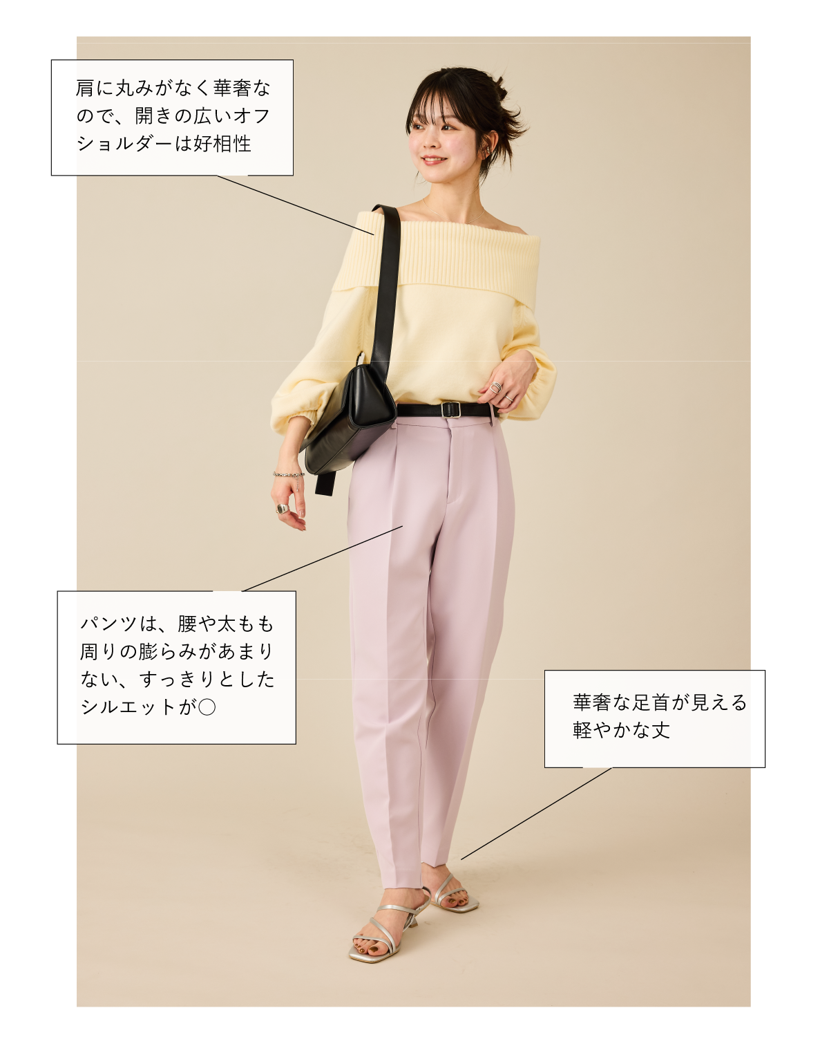 ウェーブタイプは、体はうすく、華奢で、下重心。やわらかな曲線を描くボディが特徴なので、身につけるものも薄くやわらかな質感を選びましょう。また寂しい印象にならないよう、装飾のあるデザインやアクセサリーなどの足し算スタイルも必須。ソフトで華やかさを意識したコーディネートを心がけましょう。