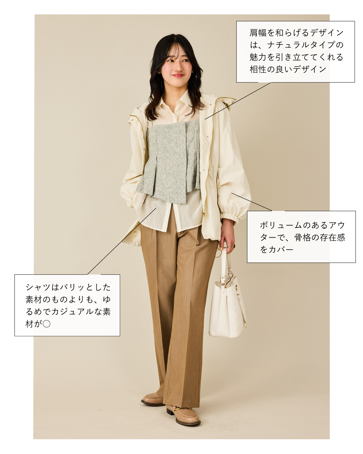 ナチュラルタイプの人は、筋肉や脂肪があまり感じられないスタイリッシュなボディを持っています。骨組みがしっかりしており骨が太め&大きめで、関節の存在もわかりやすいタイプなので、風合いのある素材感でゆったりしたデザインのアイテムを選びましょう。ラフな雰囲気を意識した、大人カジュアルなコーディネートがおすすめ。