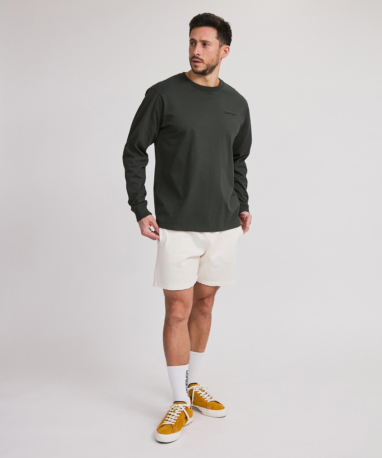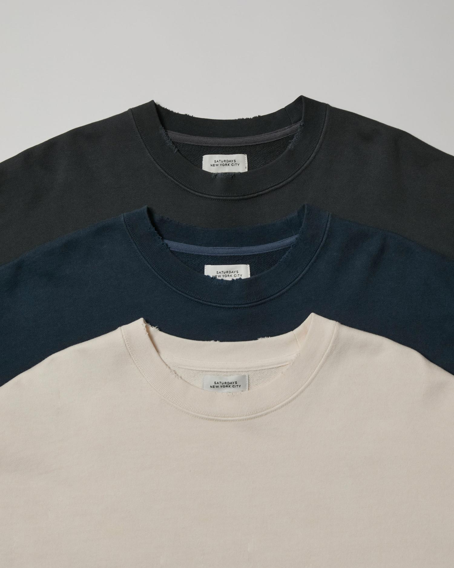 Saturdays NYCでは、製品染めとダメージ加工を施したヴィンテージライクなスウェットを展開しています。バックにスラッシュプリントが映える「クルーネックスウェット」と、サタデーズ定番のシルエットを採用した「スウェットショートパンツ」をラインナップ。いずれもスラッシュロゴをデザインに落とし込み、加工感のあるこなれた風合いを楽しめる一着です。