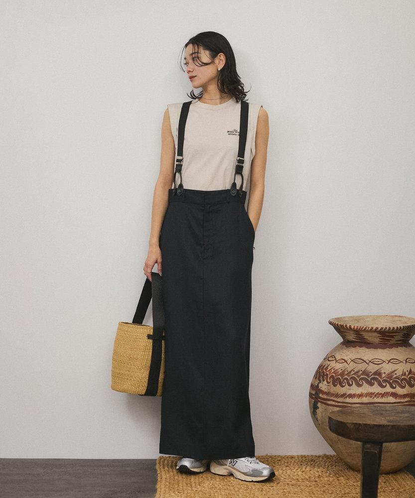 マスキュリンなサスペンダーと、エフォートレスなリネン生地のスカートの掛け合わせがベストバランスな一枚。