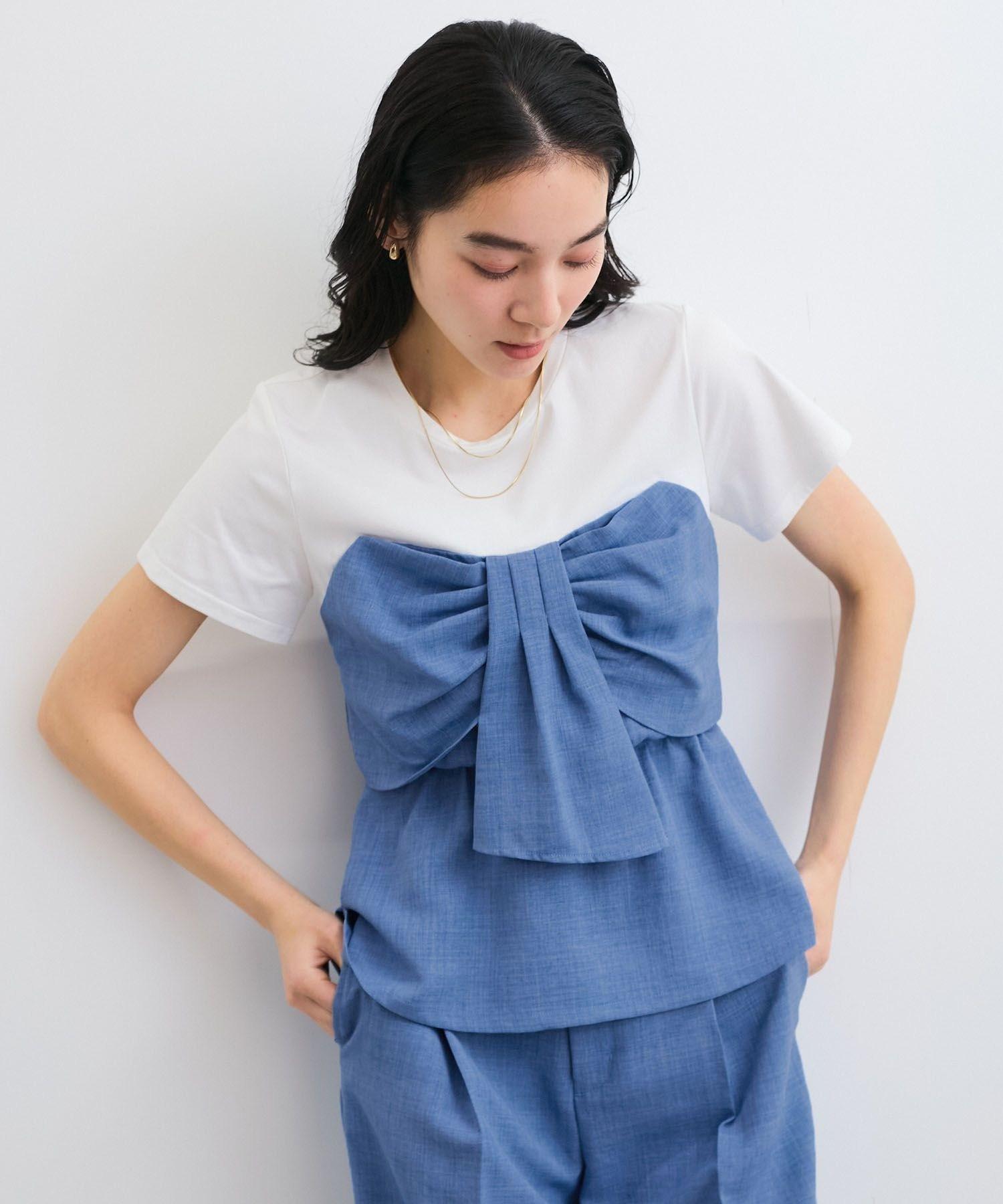 まるでリボンをしているかのように見えるリボンディテールがフェミニンなビスチェドッキングのTシャツです。
