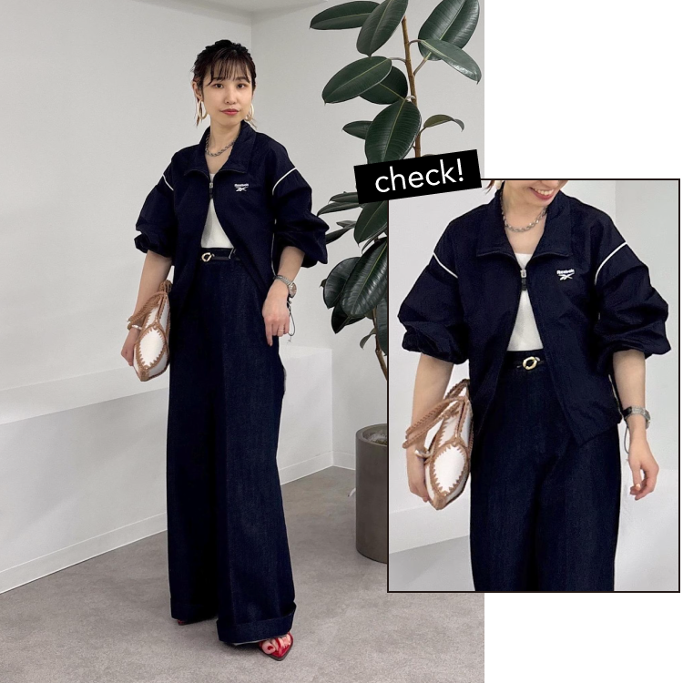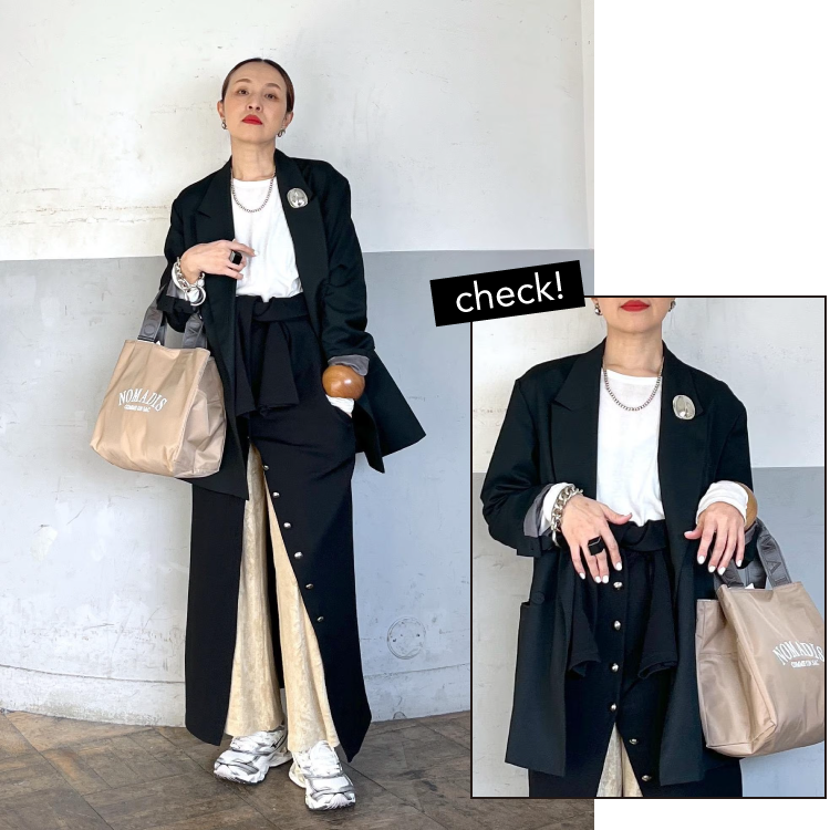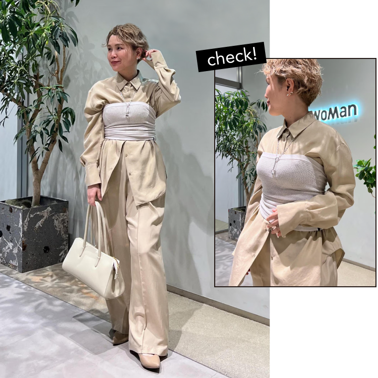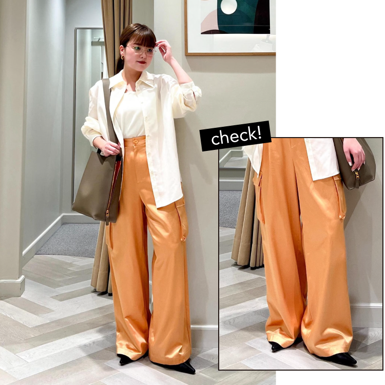 袖の部分を腰巻きにすることで、後ろから見たらロングスカートに見えるのがポイント。
