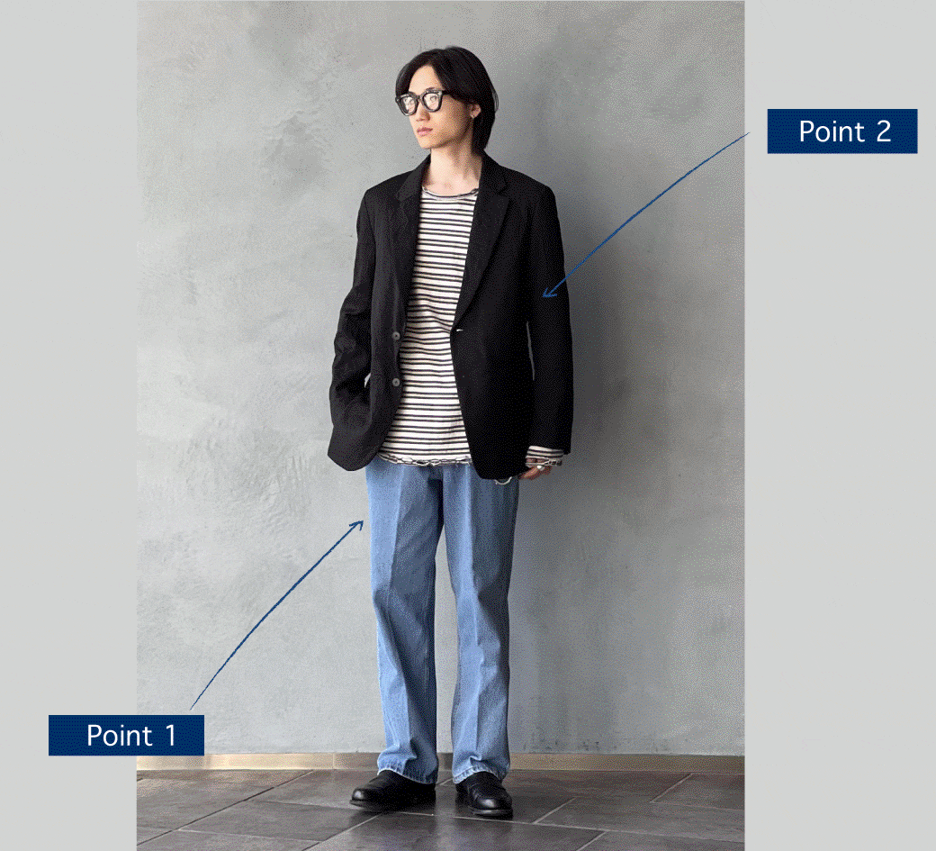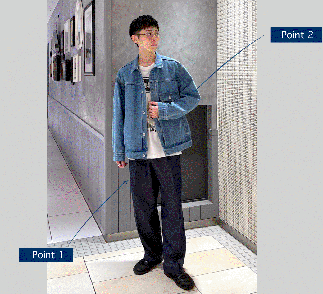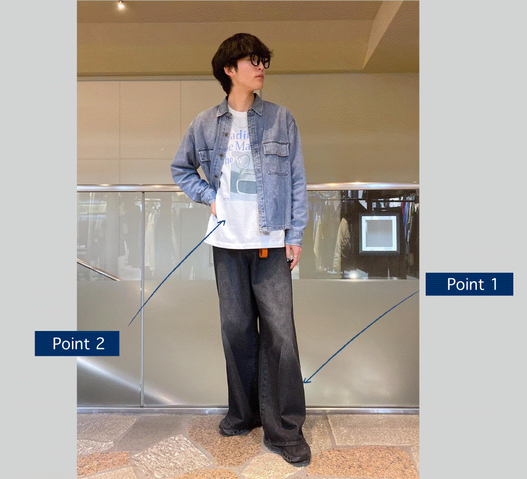 カジュアルすぎず海外風なイメージで組んでます!ワイドストレートのリラックスしたサイズ感ではあるものの、絶妙な丈感と落ち着いた加工感が大人のシルエットに。