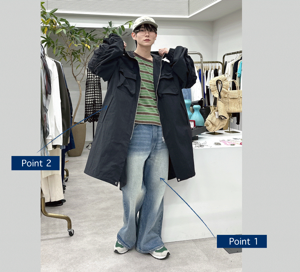 ナイロン素材でハリ感のあるライトアウターは、ユニセックスで着用しやすいビッグシルエット。裾のボタンの留め方でオールインワン風にも着こなせるので、朝昼の気温差に合わせてさまざまな着こなしを楽しめます。