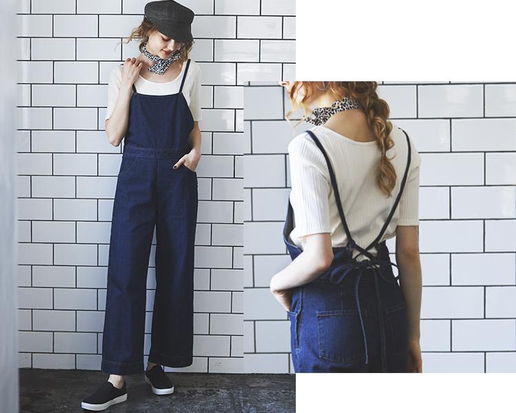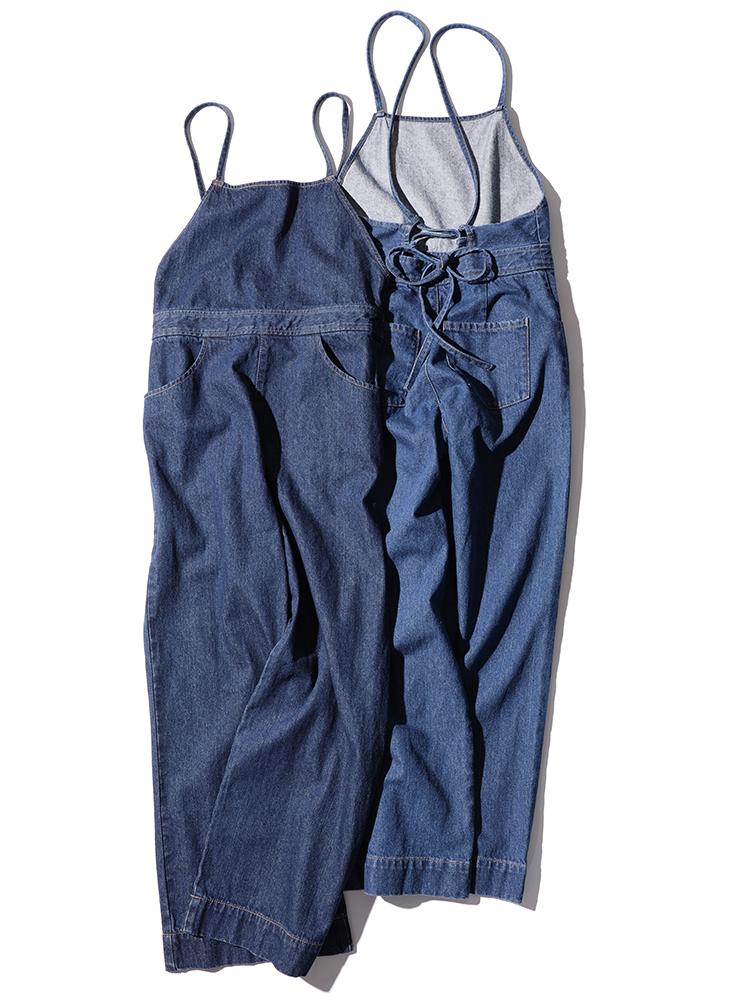 バックスタイルのレースアップディテールが目を惹くデニムサロペット。 華奢なショルダーストラップを採用して、カジュアルになりやすいデニムサロペットを大人っぽくアレンジしました。 フロントはシンプルな仕上がりで、前後で異なる雰囲気が楽しめるようデザイン。 スウィートなブラウスを合わせて、ミックス感のあるスタイルを楽しむのがおすすめです。