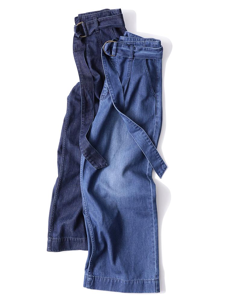 ハイウエストで穿く、クラシカルなワイドデニムパンツ。 共布のサッシュベルト付きで、トップスインがすっきり仕上がります。 裾まできれいに広がるシルエットで、脚のラインがカバーできるのも魅力です。