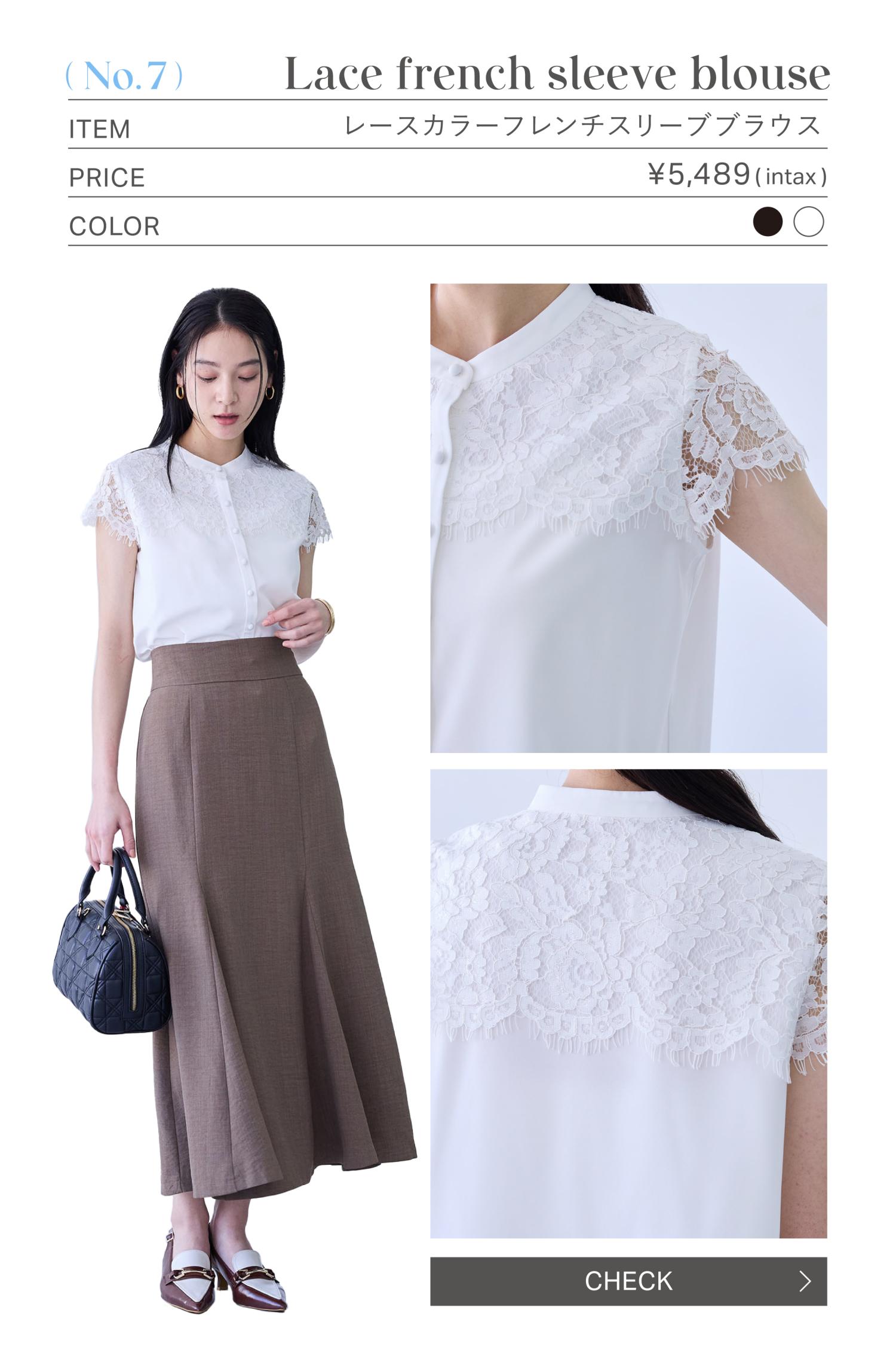 袖口は折り返しデザインを施し、フレンチスリーブが腕まわりをさりげなくカバーし華奢見せ効果も。