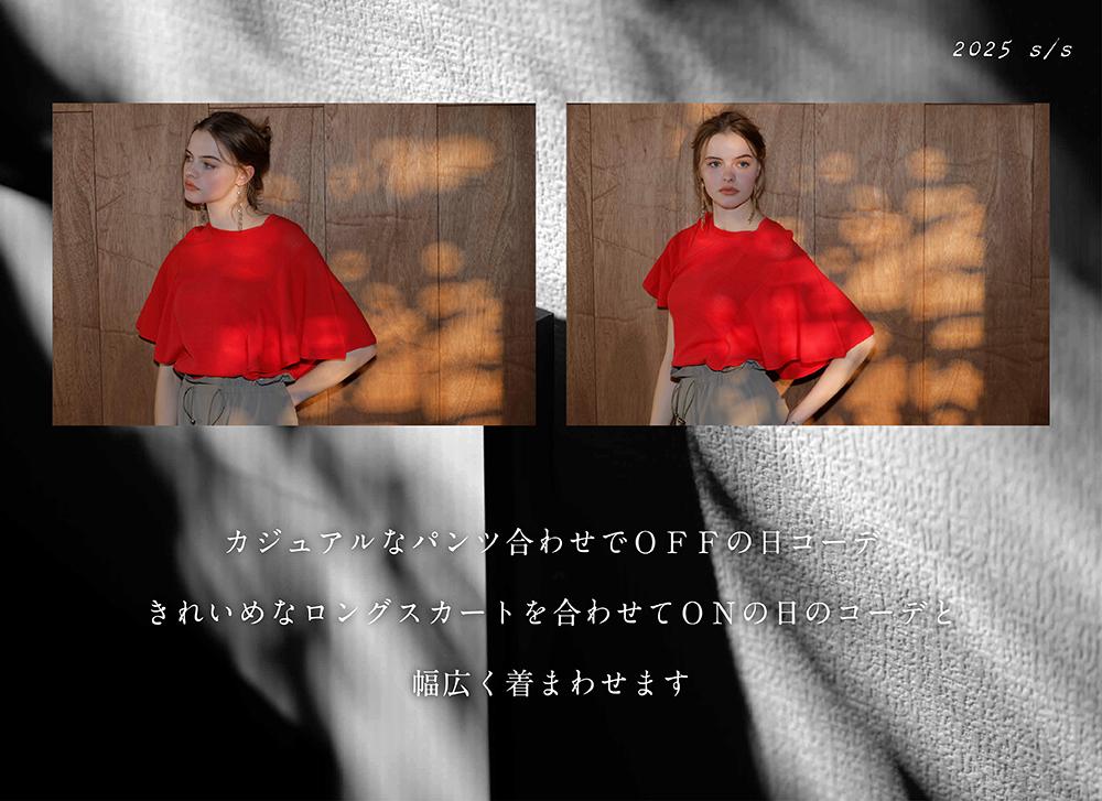 袖がフレアになったトップスで肩のラインが丸く、緩やかに見えるのが特徴。