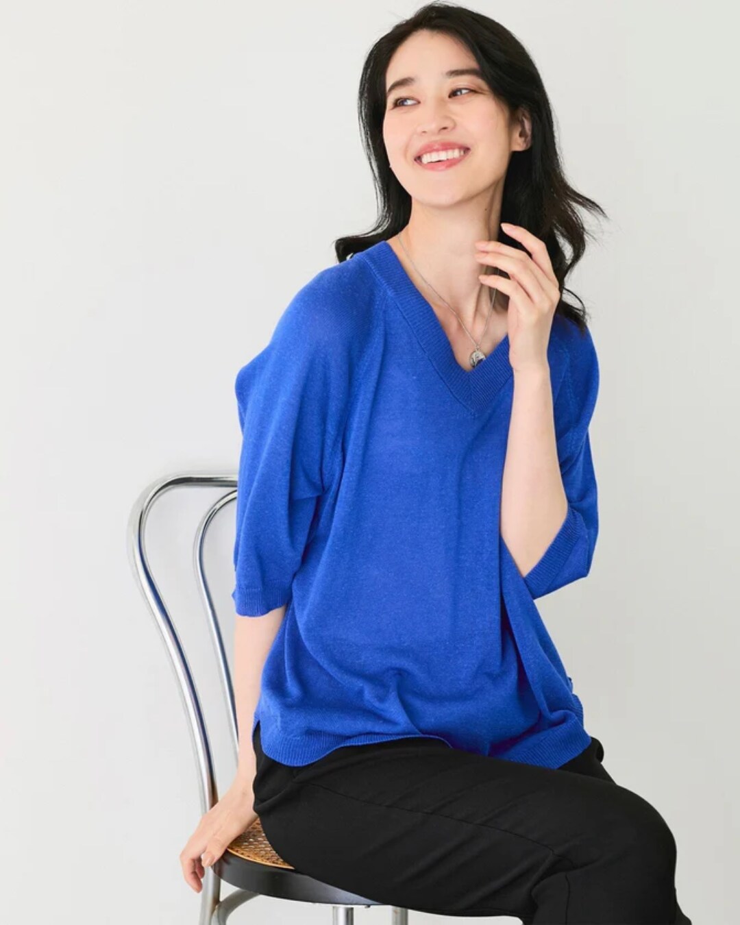 シンプルながらも美しいシルエットを描くVネックのサマーニット。