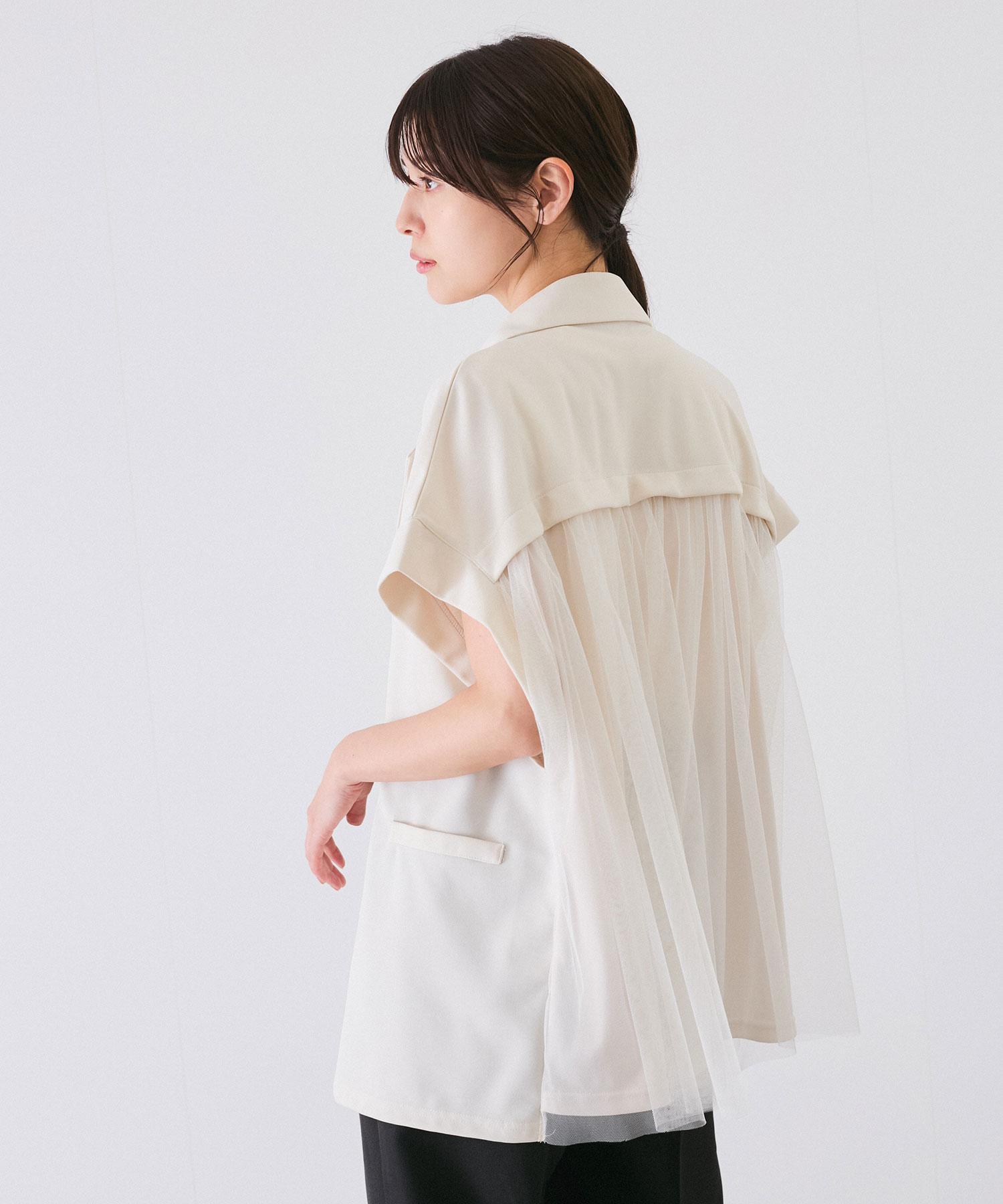 背面に施された繊細なチュール素材が、華やかなアクセントとなり、特別なシーンやお出かけにぴったりの一着です。シンプルなフロントデザインと対照的に、背面のディテールがポイントとなり、後ろ姿まで美しく演出します。上品さと女性らしさを兼ね備えたアイテムです。