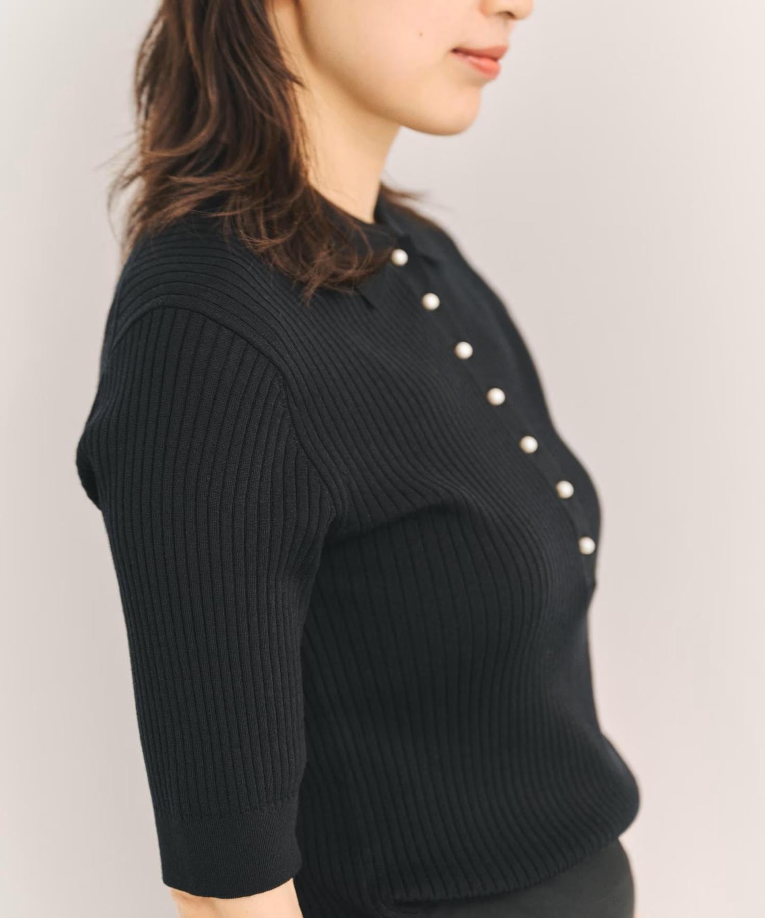 小さなパールボタンが品よく映える、クラシカルなポロ襟ニット。