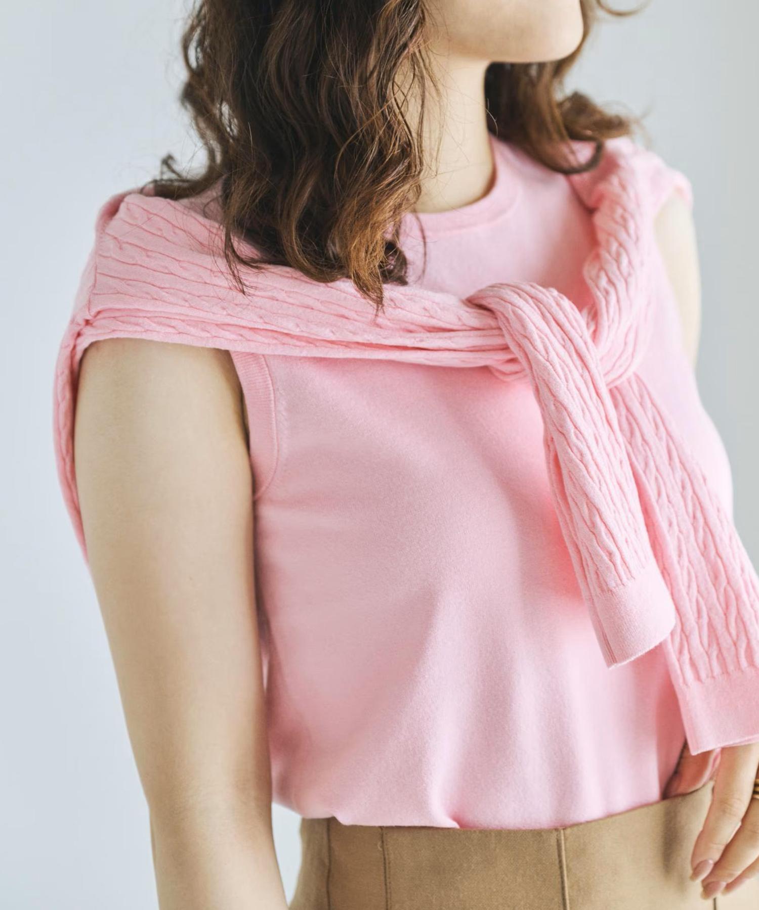 ショート丈カーディガンとノースリーブプルオーバー2点セットのアンサンブル。