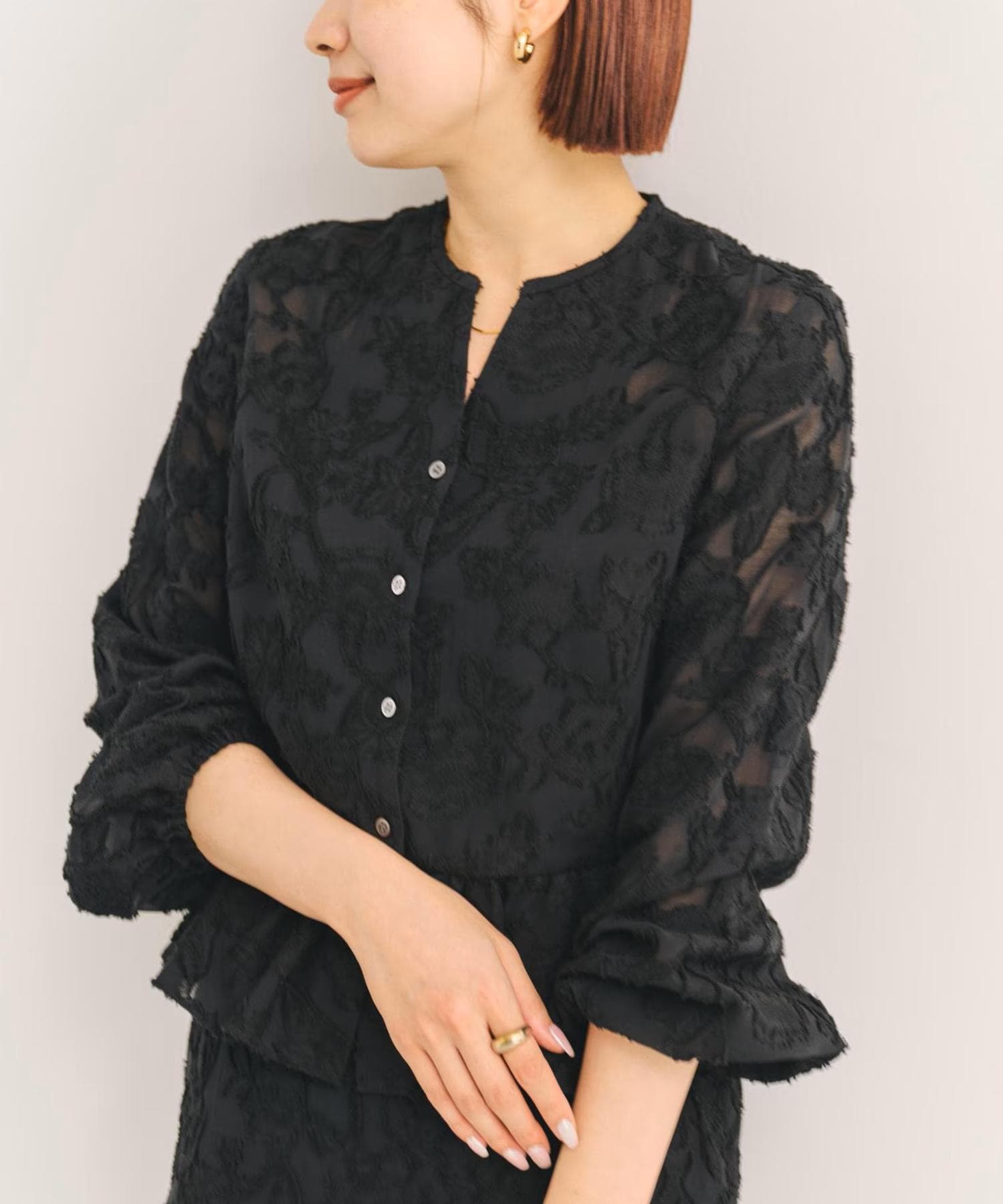 表面感のあるカットジャガードのブラウス。ペプラムデザインがスタイルアップをかなえてくれる一着です。