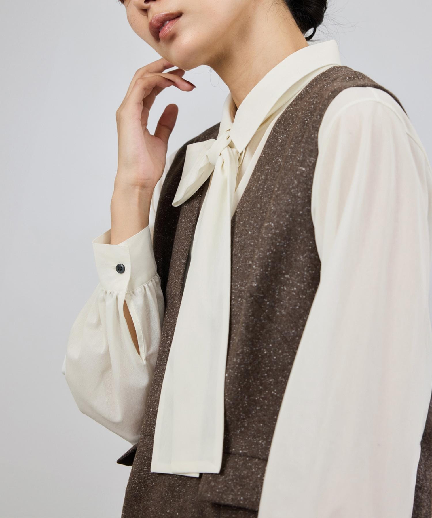 リボンタイとギャザー袖が華やかさを添える、フェミニンなシアーシャツブラウス。