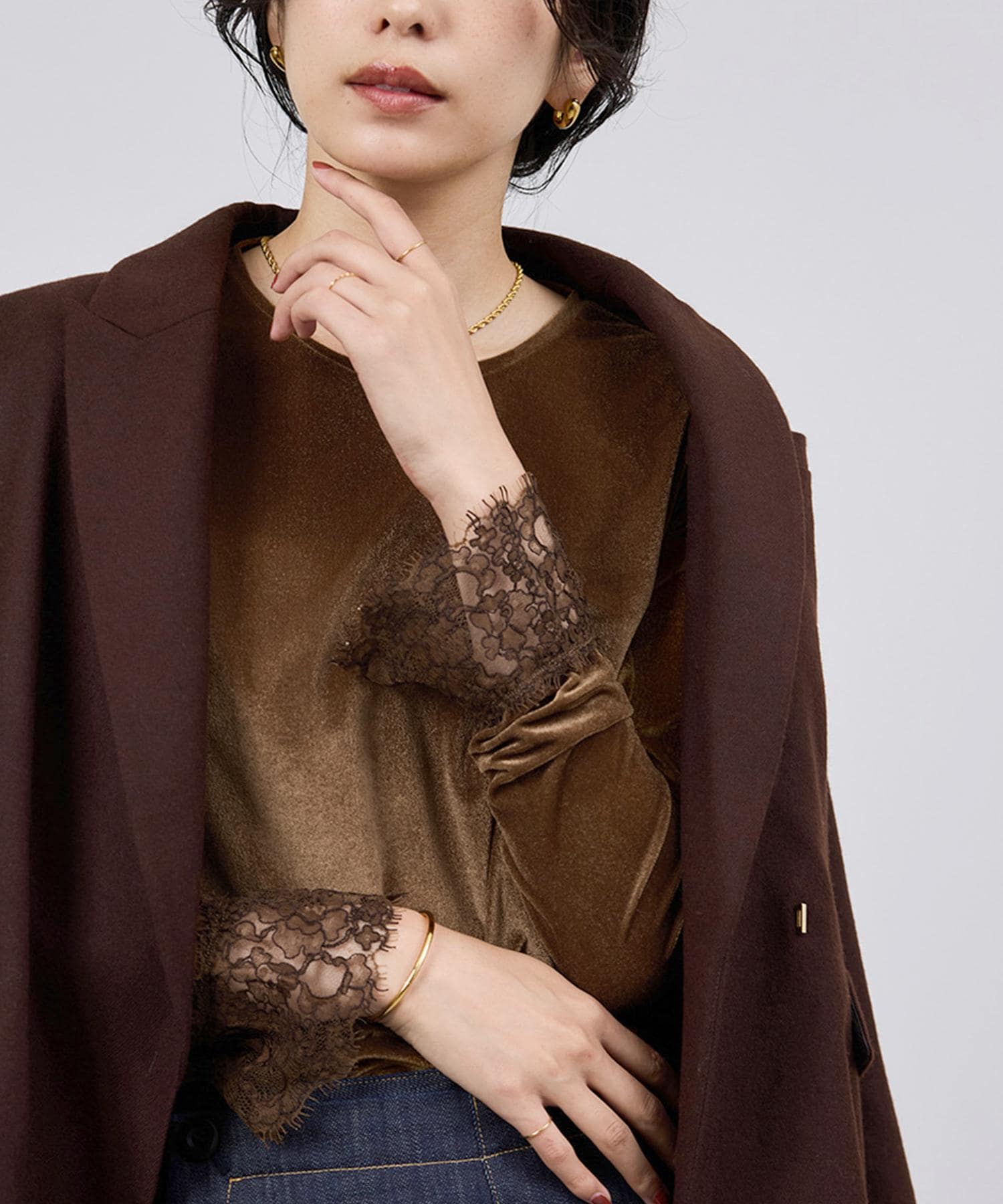 袖口のレースで差をつける、秋冬に映えるシアーベロアカットソー。一枚着ではもちろん、ジャケットとレイヤードしても袖口からレースがのぞく秀逸なデザインが魅力です。