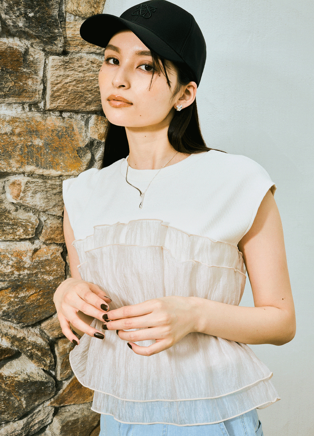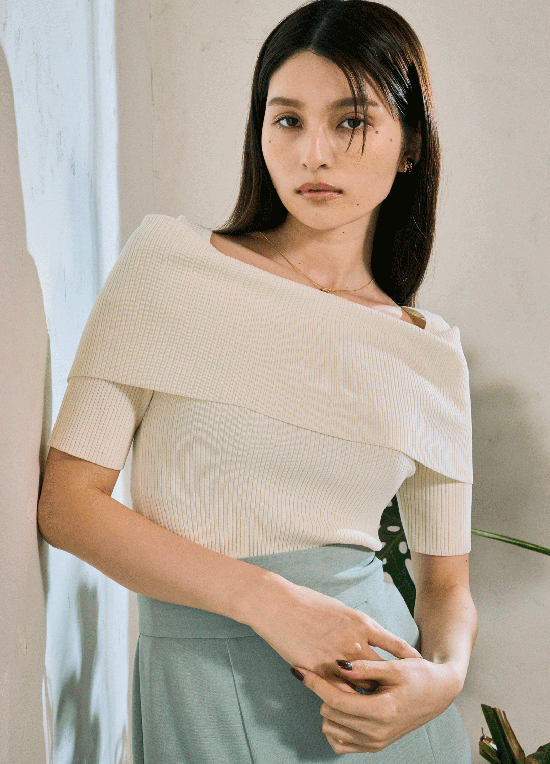 ・リブ編みのカットソーはフレンチスリーブで程よく肩を隠してくれる万能型