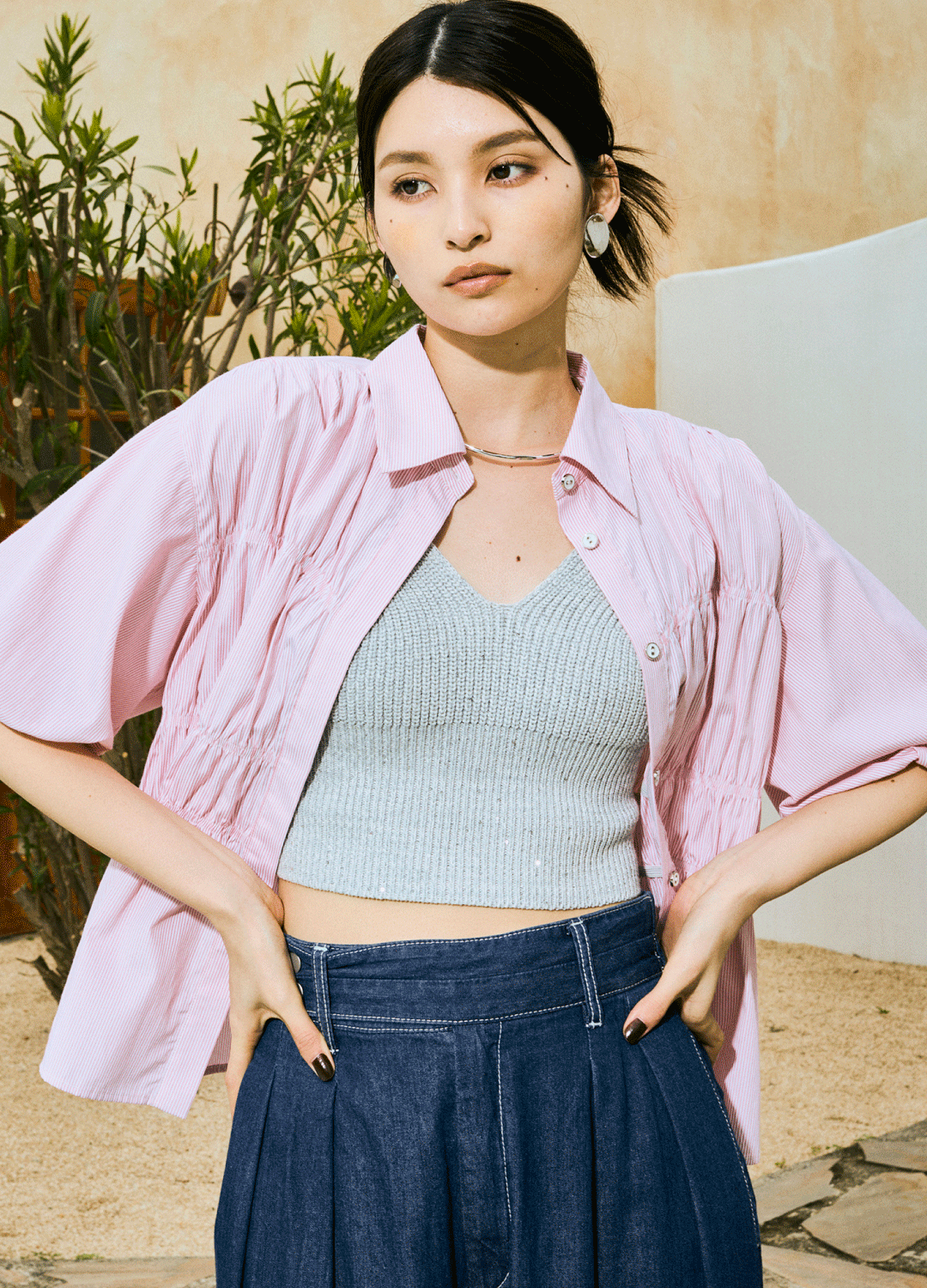 ・シャツを土台にビスチェ風のシャーリングを施した今年らしいデザインシャツ。