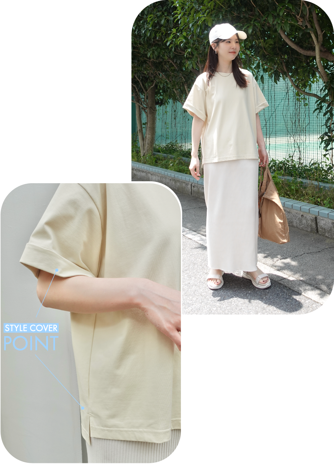 サイドスリット入りの裾は後ろが長めになっているので、おしゃれしながらヒップ周りもカバー。