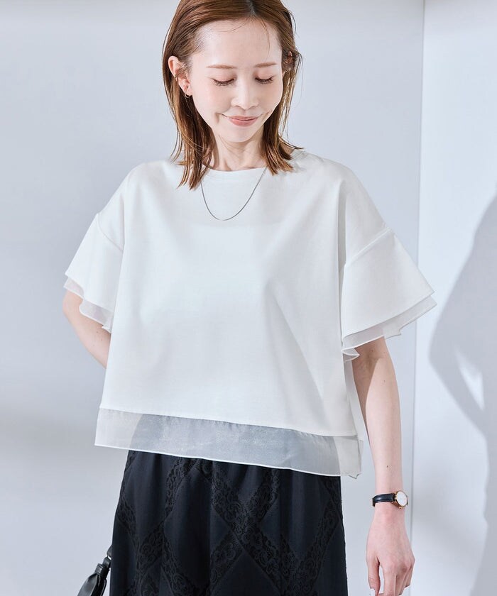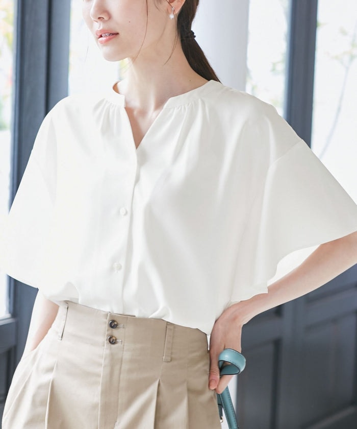 涼しく着られて夏に向けて活躍の半袖ブラウス。 綺麗めな印象の素材感なのでオンオフ両方で大活躍。また日常のお洗濯でも形崩れしにくい取り扱いやすさで人気急上昇。