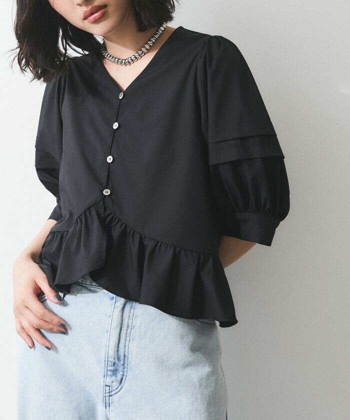 袖のタックや太めのカフス、裾のフリルが華やかな女性らしいシルエットのブラウス。パフスリーブや裾のフリルにこだわったデザインで、スッキリとした浅めのVネックや前中心の裾のラウンドが魅力的な1枚。ボタンを開けて羽織としても着用可能です。
