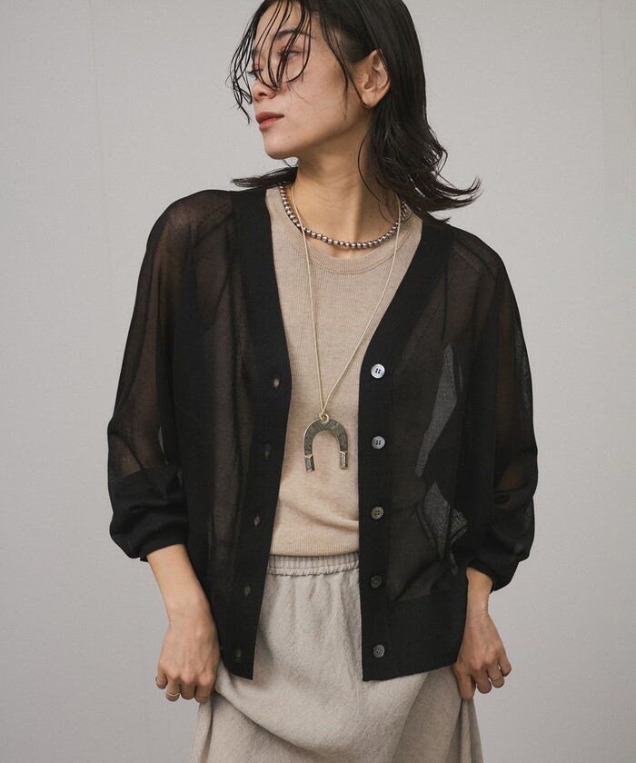 さり気ないラメがスタイリングを華やかにしてくれる、毎年大好評のシアーVネックカーディガン。短すぎずバランスのいい着丈と、ラグランスリーブで腕まわりはゆったりとしていて、ストレスフリーな着心地。非常に軽く、シワにもなりにくいので持ち運びがしやすいのも嬉しいポイントです。