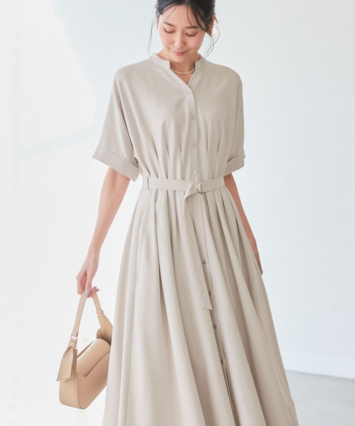 お出かけ着としてあると便利なシャツワンピース。ウエスト周りは細かなタックを施しているので、メリハリの出るシルエットを演出。お仕事だけじゃなく普段着にも使いやすい万能なデザインです。