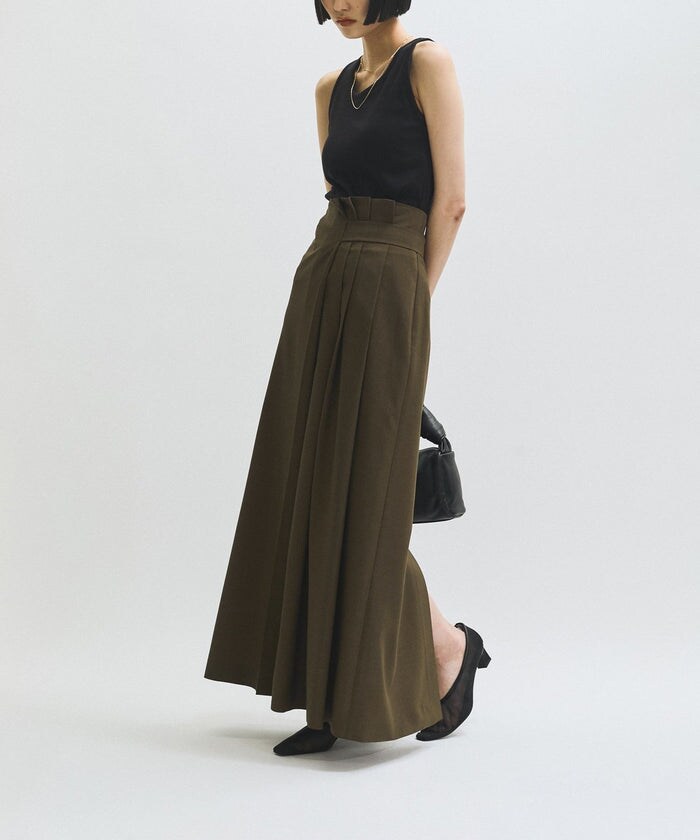 落ち着いたカラーとタックデザインで女性らしく着映えるロングスカート。ドライタッチで適度な反発感があるストレッチ性の高い素材、接触冷感、吸水速乾、防シワ性を併せ持ち、これからの時期から秋まで心地よく着用が可能です。