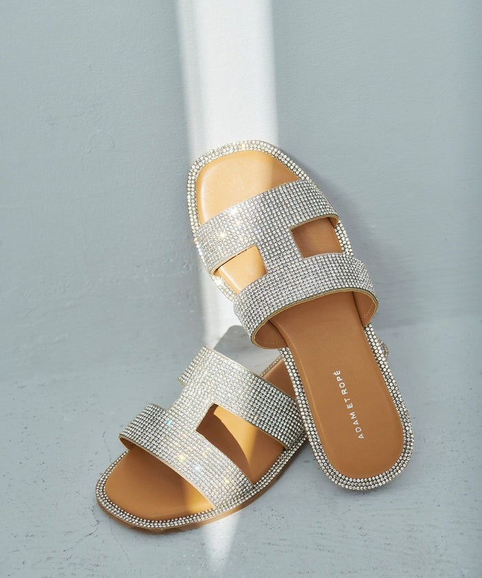 まるで履くジュエリー。履いているだけで気分が上がること間違いなしの、春夏コーデを格上げしてくれるきらめきサンダル。どんな角度から見ても輝きを放つよう、サンダルの縁にもしっかりとラインストーンを乗せているのもこだわりのポイントです。