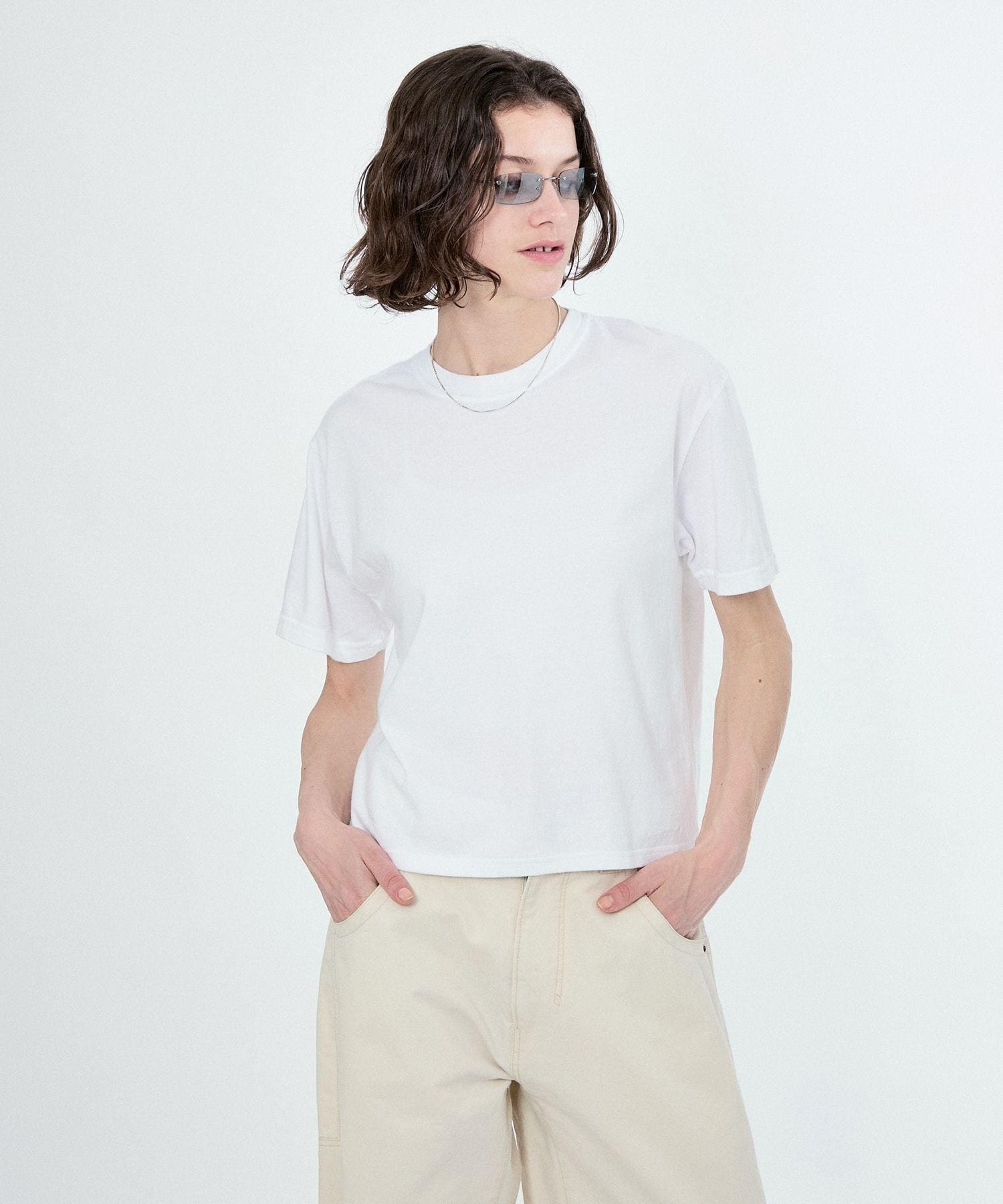 シンプルなクルーネックですが、丈をクロップド丈でオーダーしハイウエストのパンツにバランスの良い着丈を意識して作成。