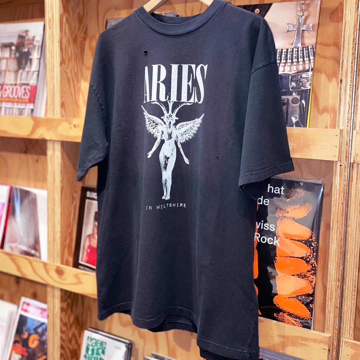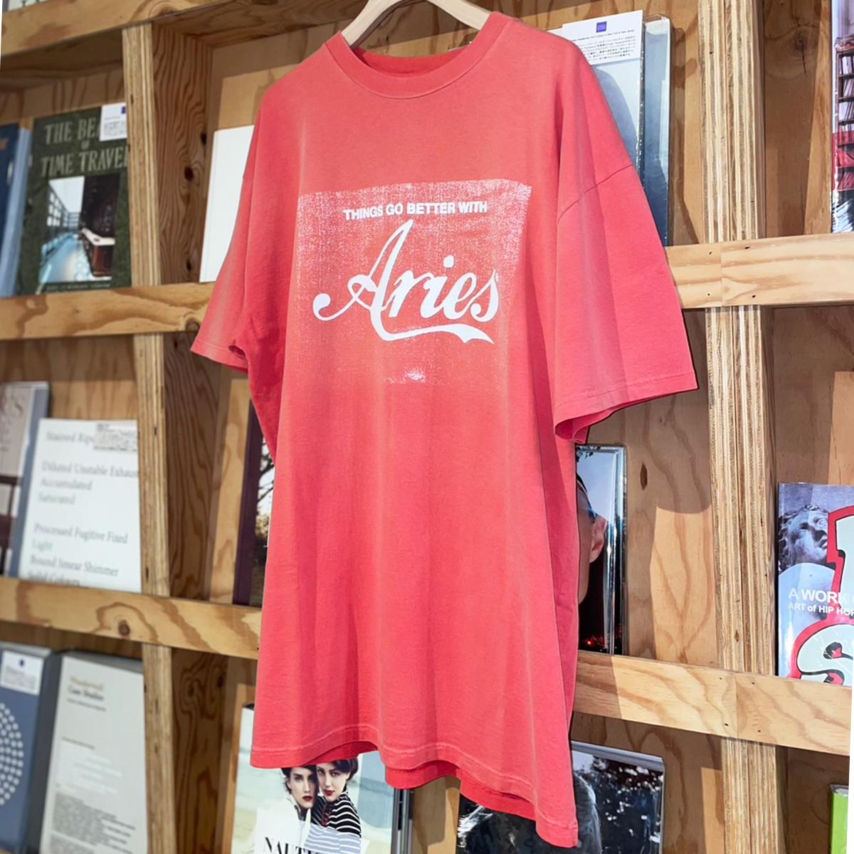 厚手のコットン素材を使用したユニセックスのショートスリーブTシャツ。フロントには、どこか見覚えのあるサンプリング感満載のAries Colaのグラフィックがスクリーンプリント。ヘビーウォッシュ加工が施され、経年変化による日焼けのような風合いに仕上げられている。