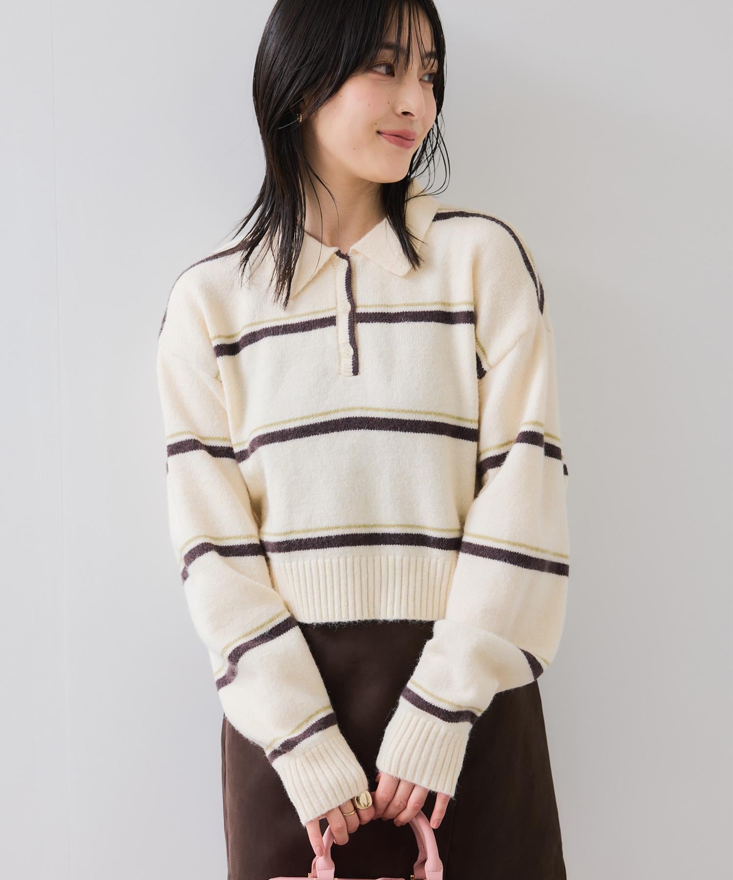 暖かく、ラフなデザインでデイリー使いしたい配色ポロ襟ボーダーニットプルオーバー。