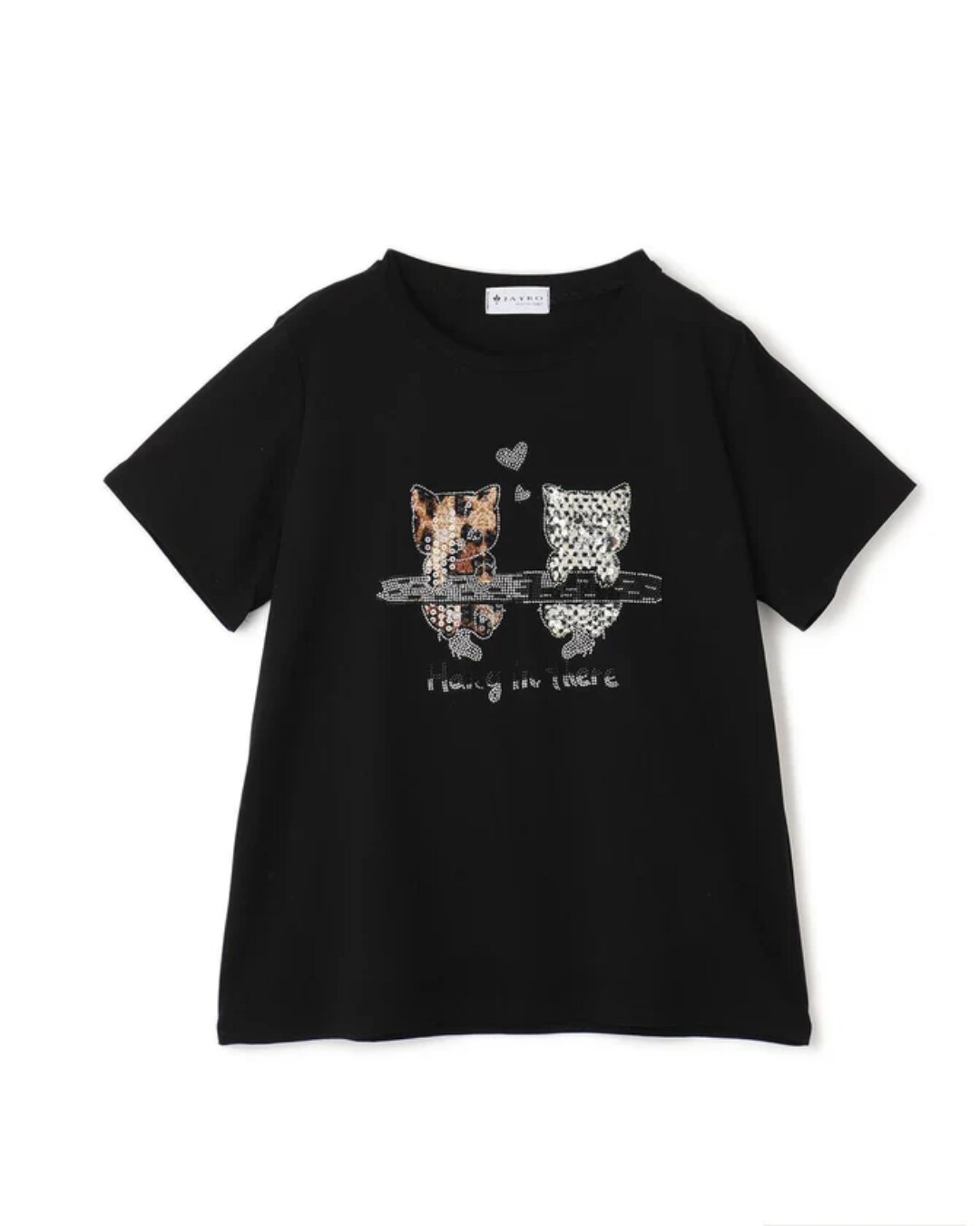 1枚でコーディネートのポイントになるスパンコール半袖Tシャツ 猫柄とスパンコールが絶妙なアクセントとなり、他では見られない個性的な仕上がりで、 注目を集めること間違いなし!