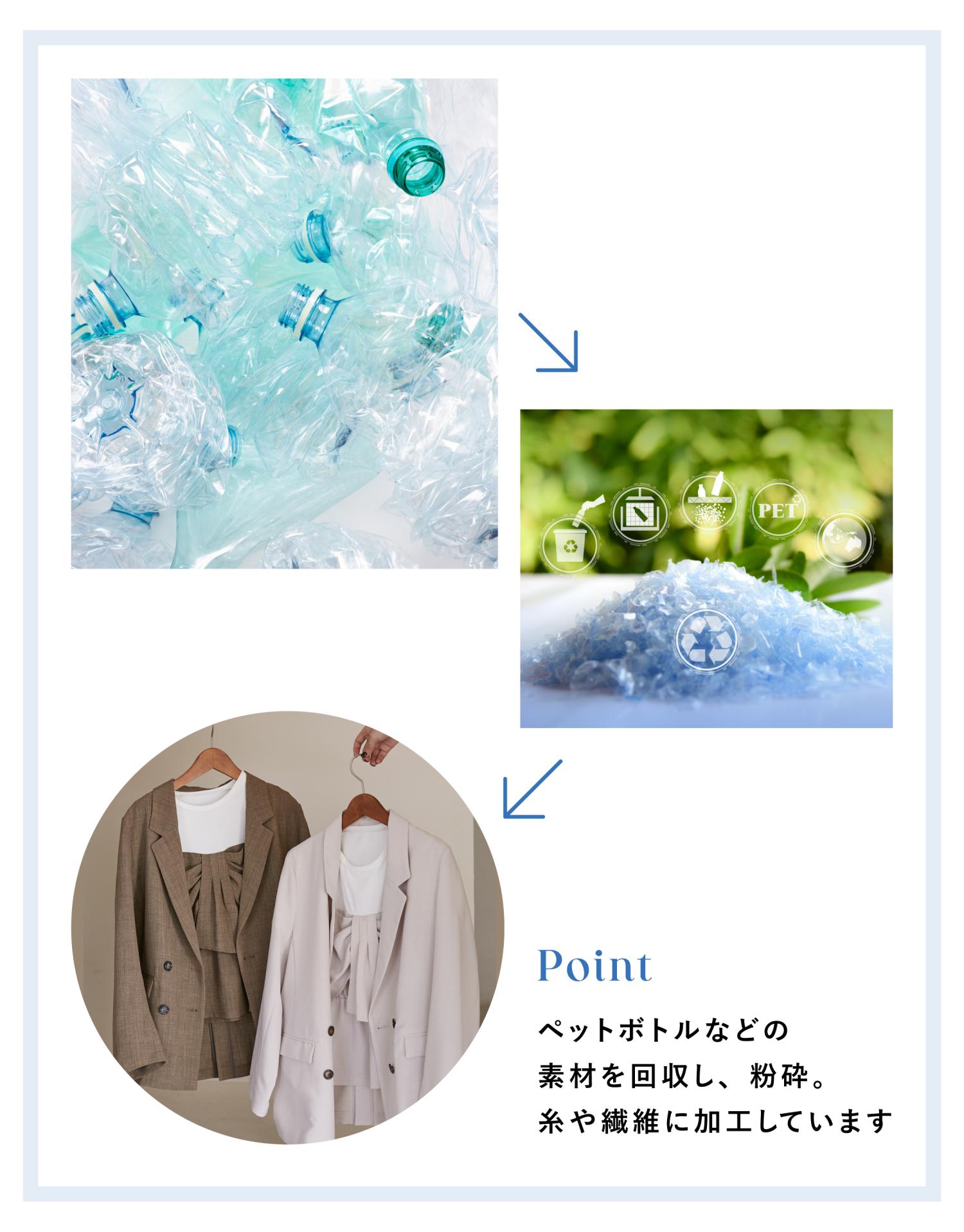 回収された繊維製品、ペットボトルやフィルムクズを利用した再生ポリエステル素材を使用しています。