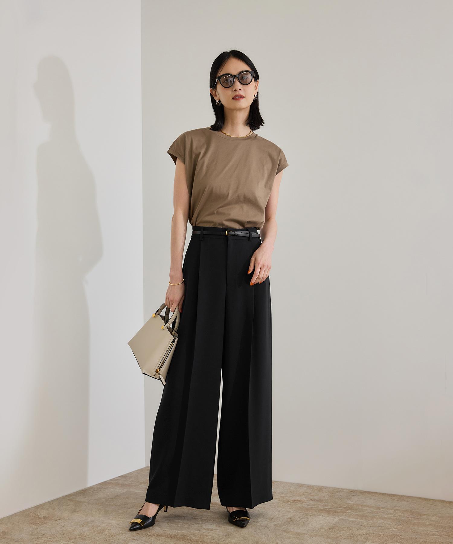 シャツブラウスやジャケットとセットアップ対応。ウエストゴムで楽に穿けて、すっきり見えが叶うストレスフリーなワイドパンツ。ツータックの立体感と、ヒップや腿まわりをきれいに見せる計算されたシルエットが魅力。ウエストコードでサイズ調整も可能。同色サテンのさりげない艶感が上品さを添え、ニットやカットソーとも好相性な着回し力の高い一本です。