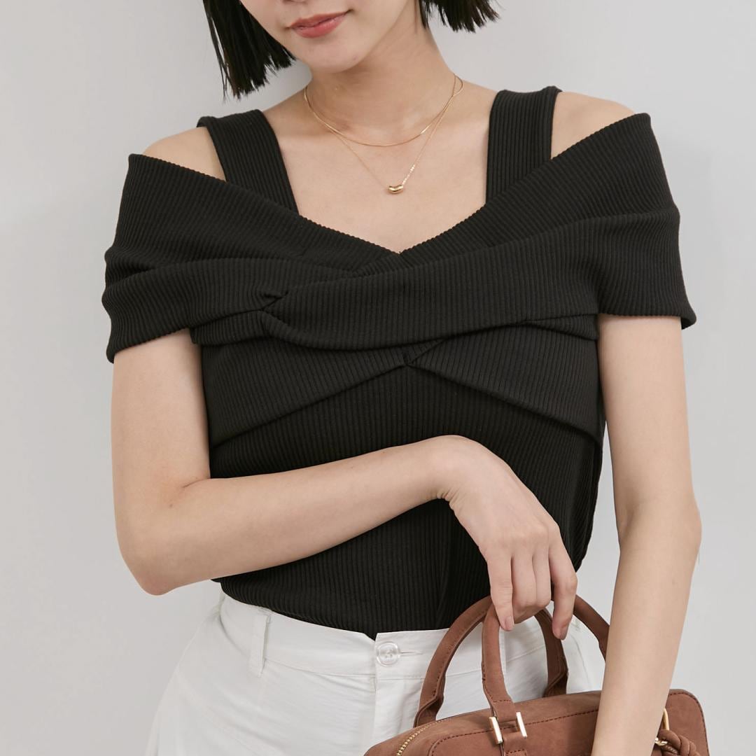 ・オフショルダーだけど、肩からずり落ちない肩マチ付きデザインで安心感もありながら、フェミニンなスタイリングが楽しめるデザイン。