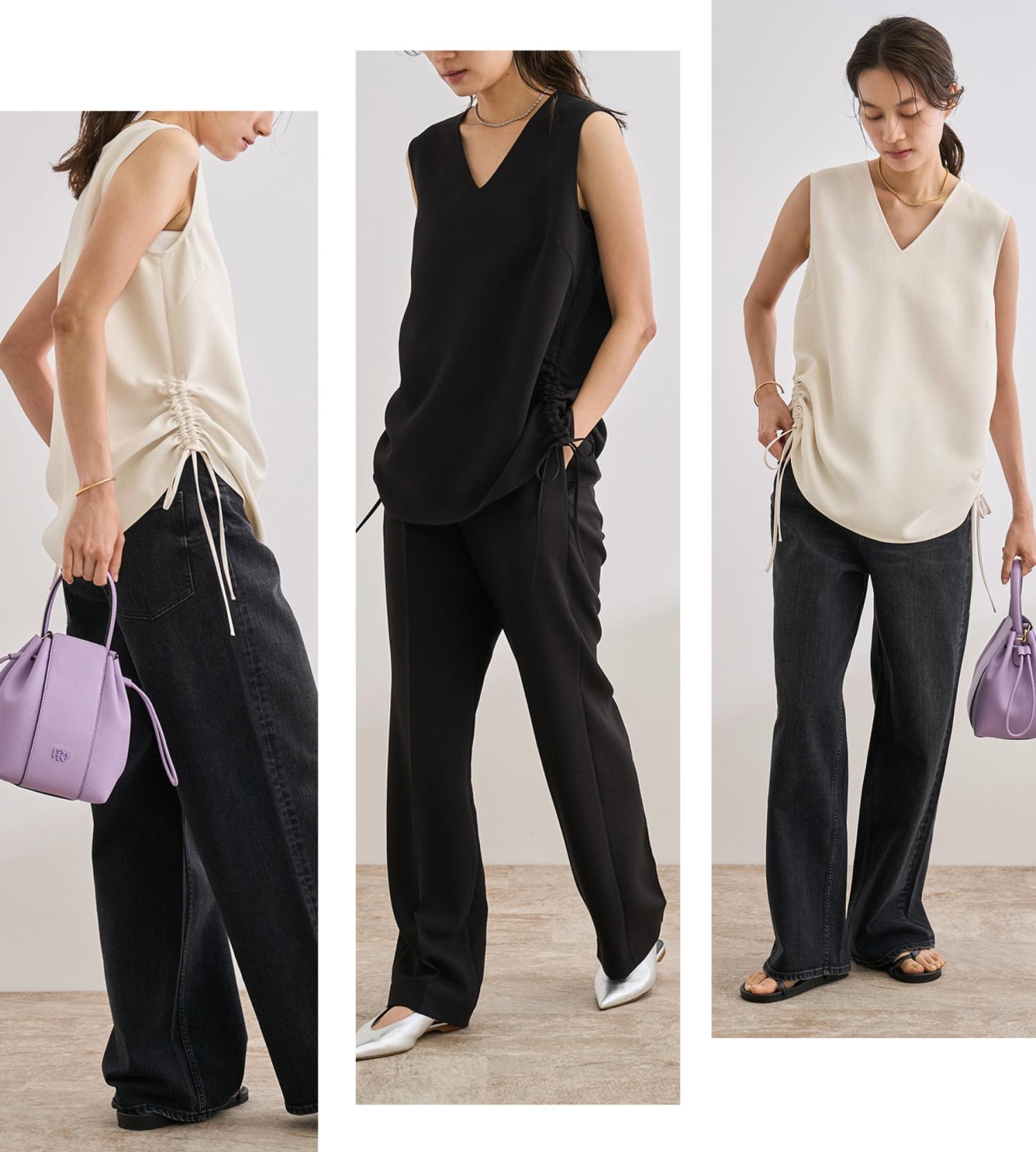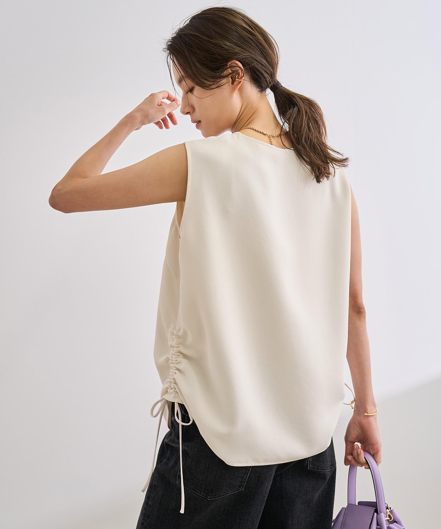 両脇のドロストでシルエット調整ができる、Vネックのきれいめノースリーブ。 羽織りを合わせてももたつかず、通勤にも活躍。