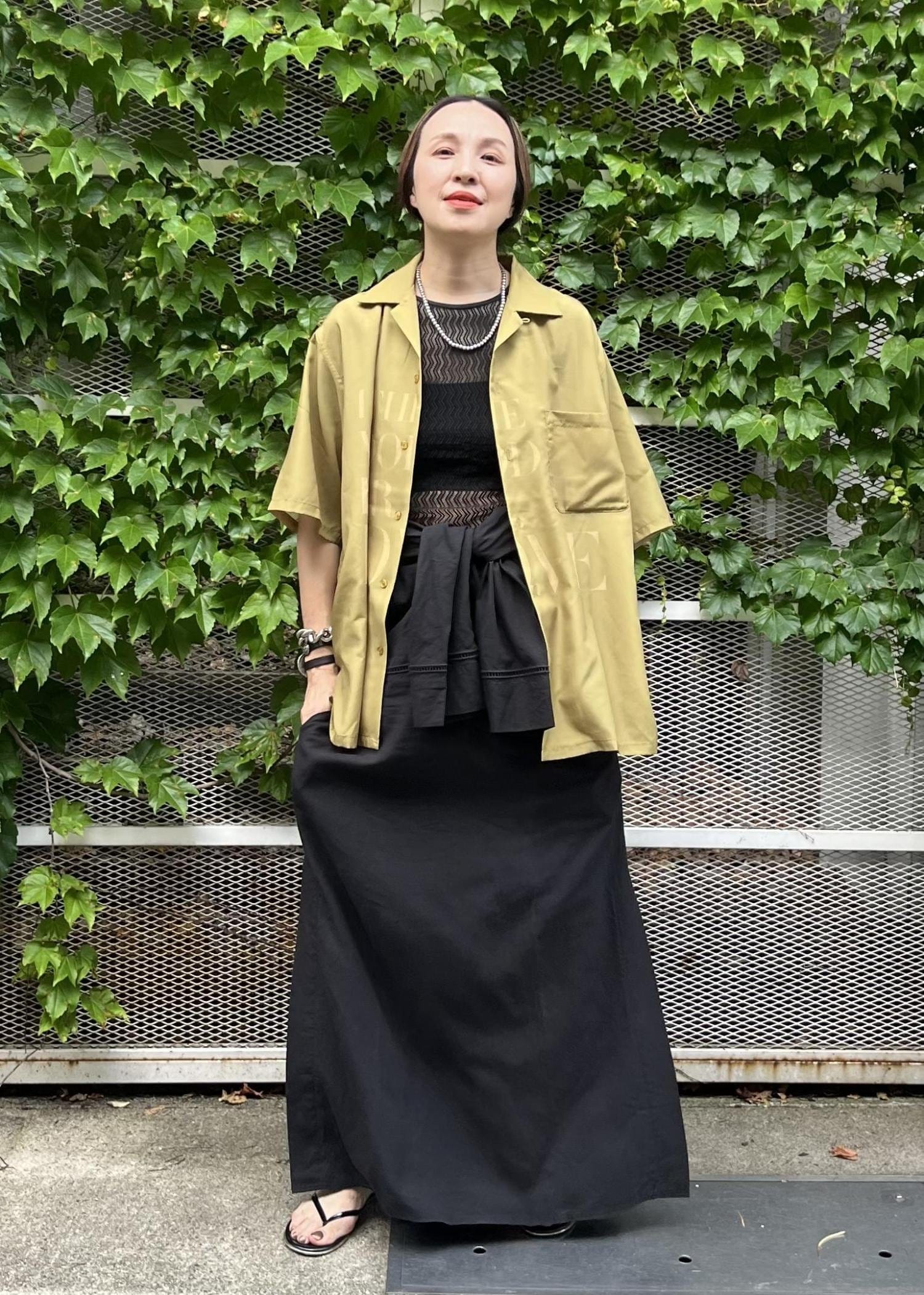 オープンカラーシャツで、1枚で着ても羽織ってもサマになるアイテムです。アジアっぽい配色とプリントが◎