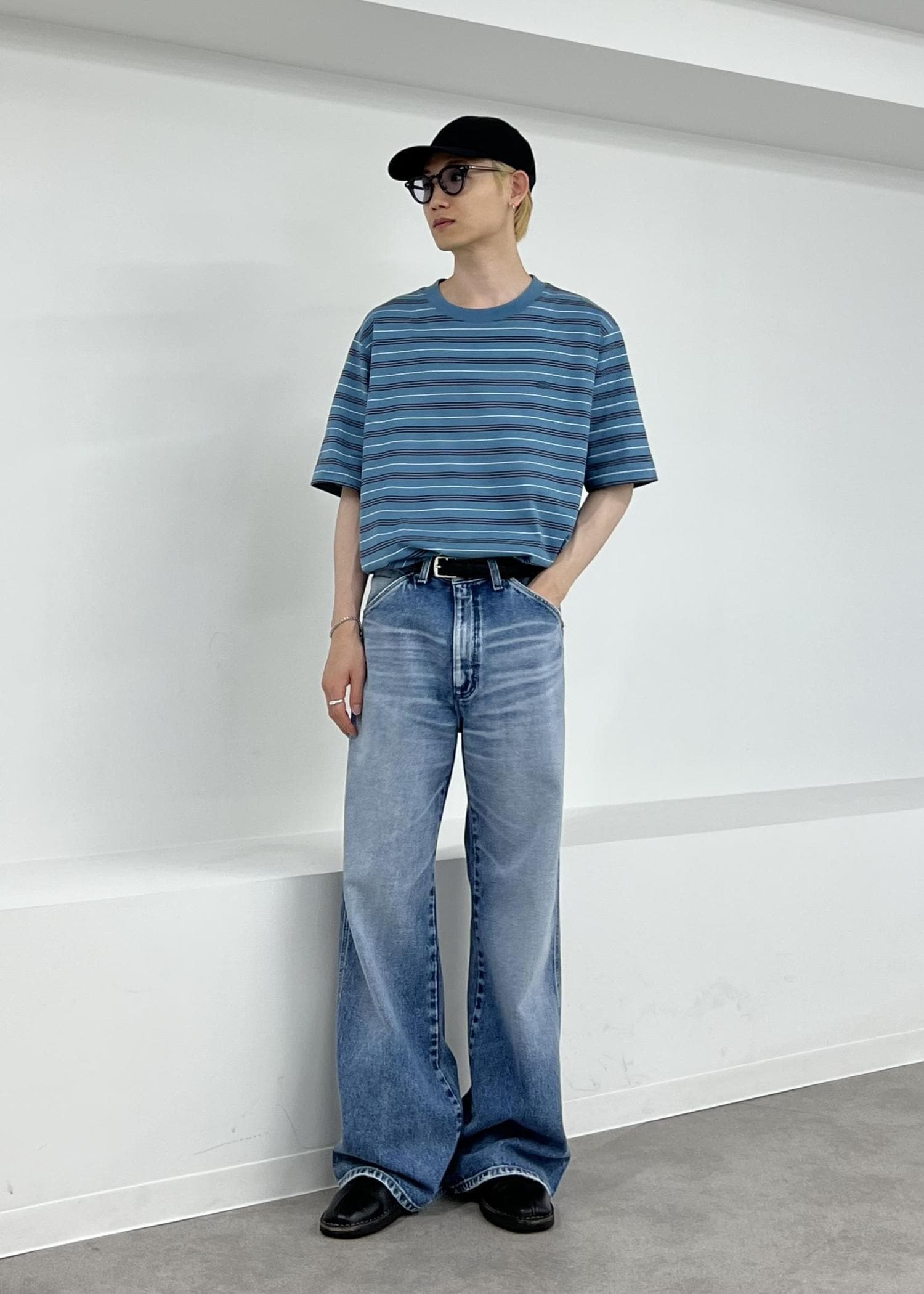 全米のカウボーイやウエスタンファンに支持されているWranglerとADAM ET ROPÉの別注デニムは、24AWに好評いただいた別注モデル『WIDE FLARE』に新色を加えたセミフレアで履きやすいデザイン。股上は深め、ほぼストレートに近い微フレアでトレンド感のあるシルエットです。程良い太さで汎用性が高く、少し薄手で通年履ける生地感なので、オールシーズン大活躍します!今回はデニムと同じブルーのラコステのポロシャツを合わせて、夏らしいコーデに仕上げました。