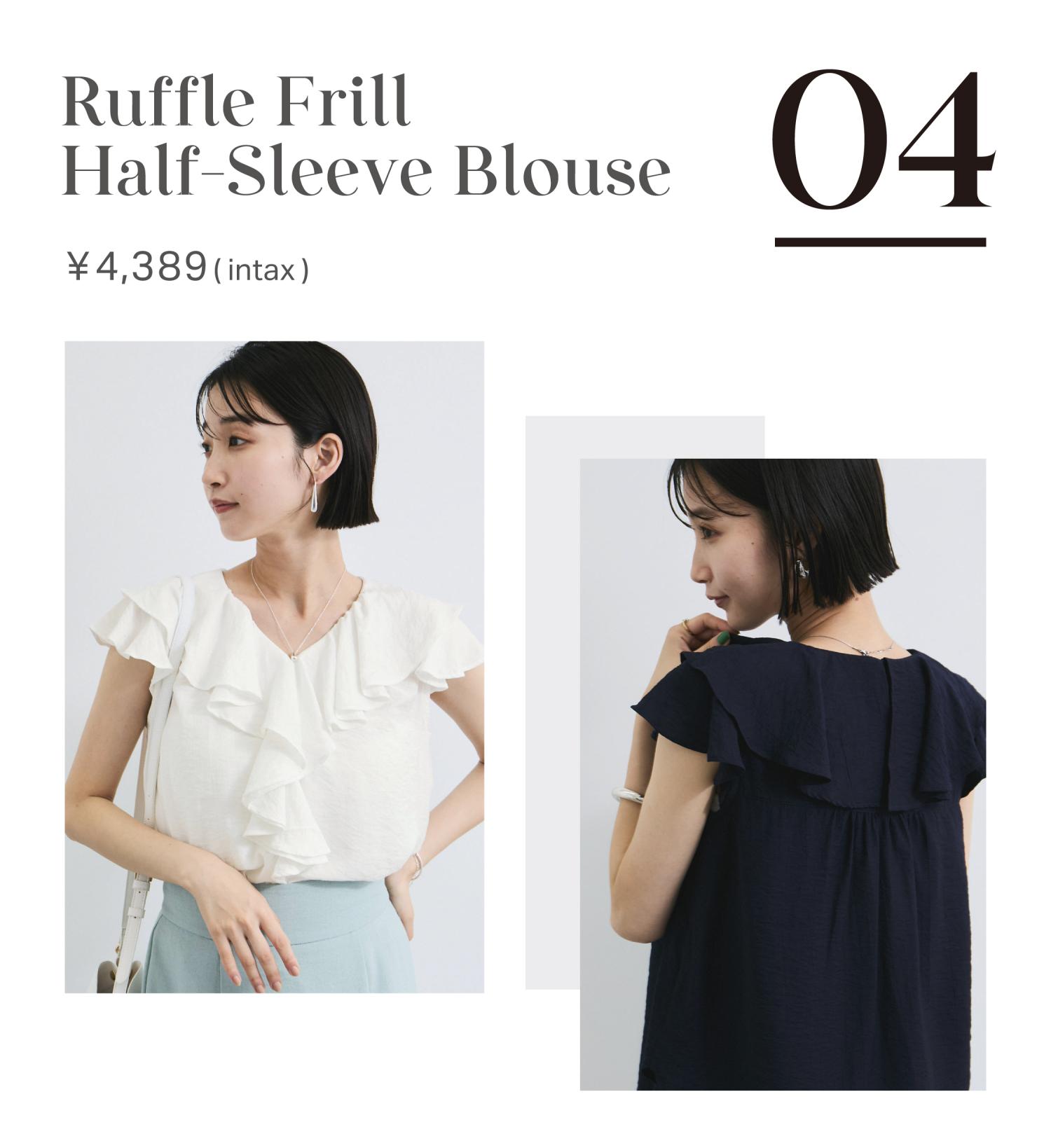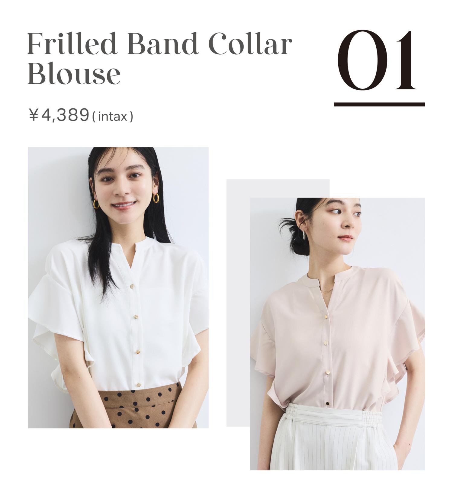 シンプルながらも袖のフリルが目を惹く、バンドカラーシャツボリューム感のあるフリルは華やかに、バンドカラーの首元はすっきりと見えるスキッパーデザインで、アクセサリーも映える一着。