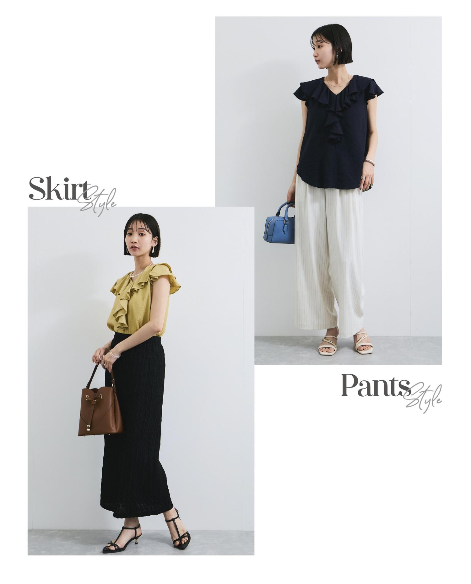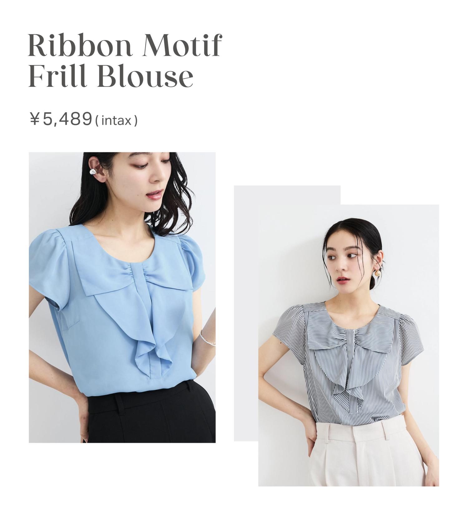 落ち感のある素材で、甘さを抑えたリボンデザインで可愛らしさと上品さを両立し、広がりすぎない控えめなフリルスリーブで腕周りの華奢見せ効果も。